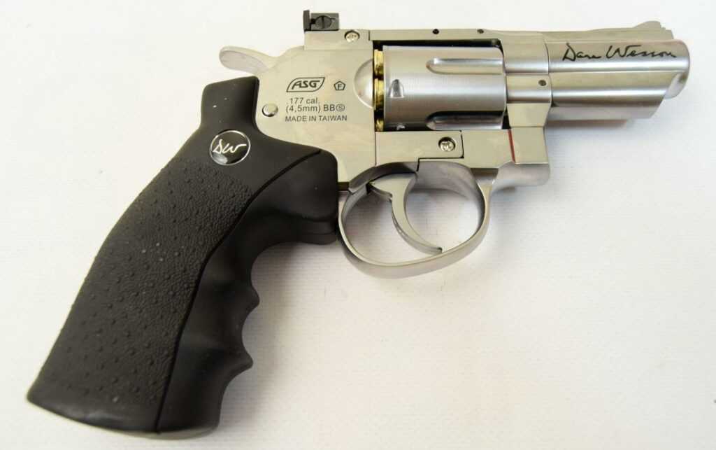 Цельнометаллический газобалонный револьвер от компании ASG внешне абсолютно идентичен боевому револьверу от Dan Wesson со стволом длиной в 2.5 дюйма. Имитирован даже механизм перезарядки револьвера, а в качестве ускорителя используются баллоны с углекислым газом.