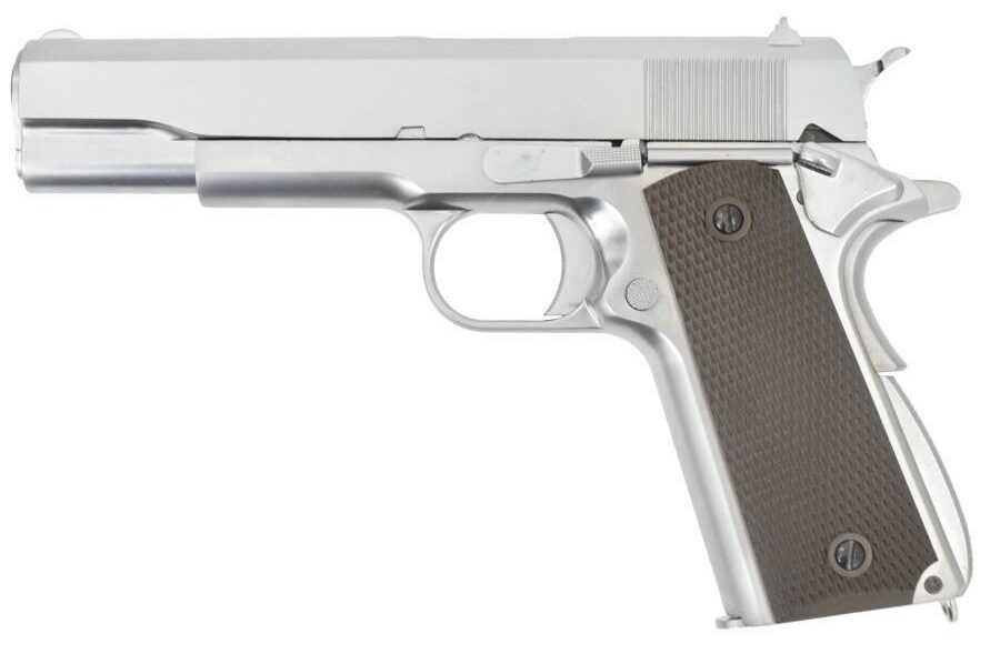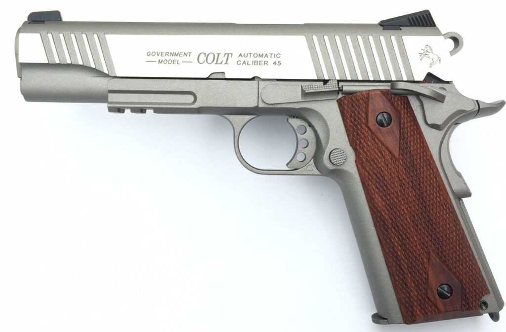 Копия классической модели Colt M1911A1, работающая с применением Green Gas. Оружие оснащено двумя предохранителями, так же, как и на оригинальной боевой модели – клавишный на рукояти и флажковый на кожухе затвора. Включена также функция blowback для имитации движения затвора.