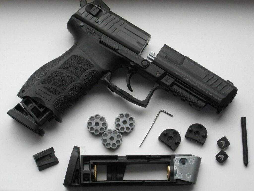 Газобалонная копия боевой модели Heckler&Koch P30 от компании Umarex может вести огонь сразу двумя типами боеприпасов – шарики из стали или свинцовые пули. Причем свинцовыми пулями пистолет может питаться только из клипа, устанавливаемого между стволом и боевым механизмом, а стальными шариками – только из отъёмного магазина.