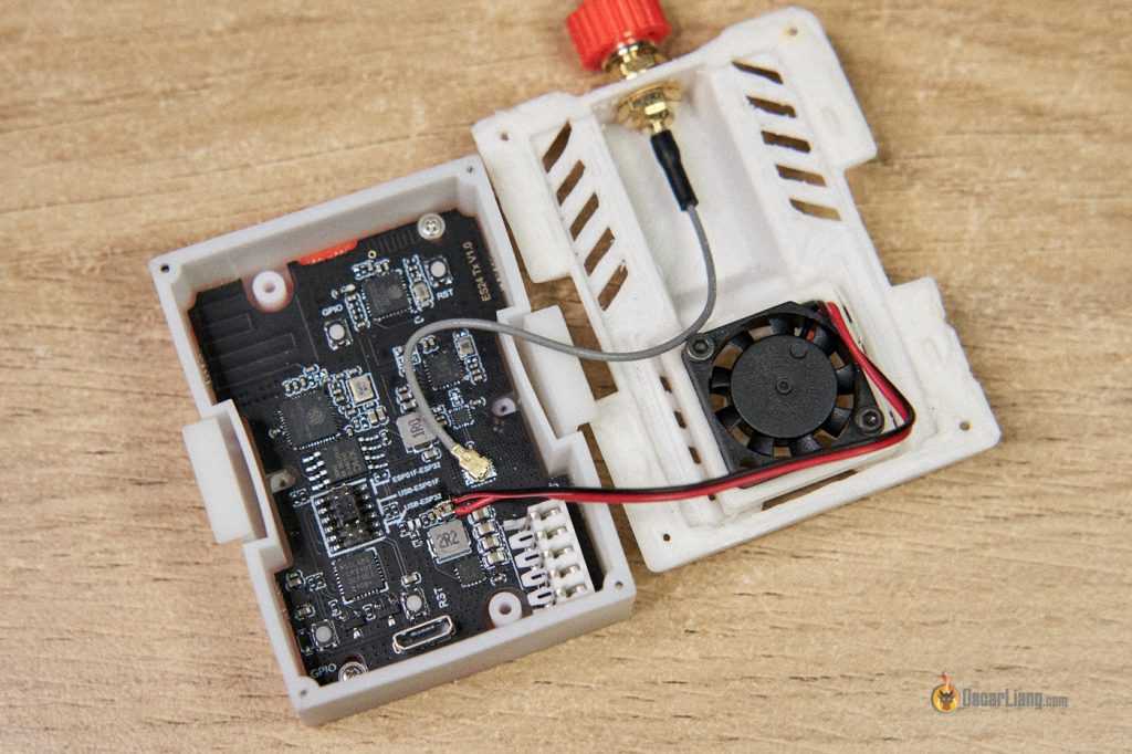 I am using a 20x20x6mm 5v fan which fits perfectly in their new module cover. The fan can be bought on Amazon (affiliate link): https://amzn.to/3ixZpE0. The fan should act as an exhaust and take the hot air out, not blowing onto the PCB to avoid dust building up inside the module. Current draw is quite low so that shouldn’t be an issue. At 5V, 0.05A.
