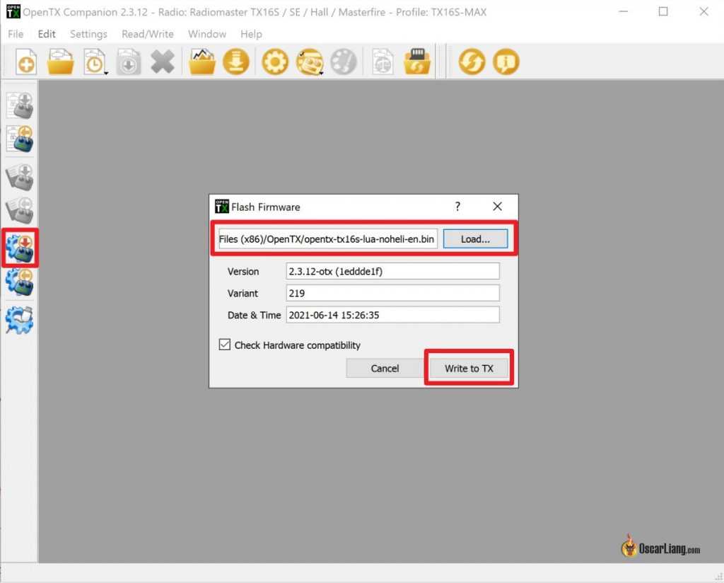 Click on the button “Flash firmware to radio” on the sidebar, load the firmware we just downloaded and click “Write to TX“.