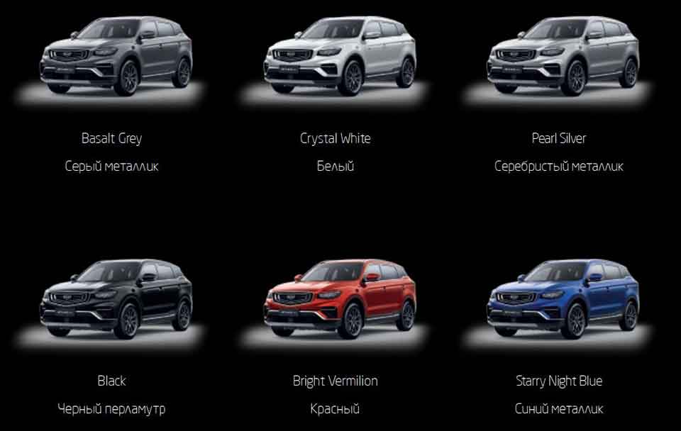 Для кроссовера Atlas Pro, продаваемого в России, доступны шесть видов кузовной палитры – белый (Crystal White), красный (Bright Vermilion), а также металлики: черный (Ink Black), серый (Basalt Grey), серебристый (Pearl Silver) и синий (Starry Night Blue). Доплачивать за кузовной цвет не нужно.