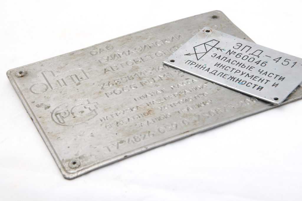 Опознаются такие таблички легко — ширина линий не меняется, а дно канавки имеет характерные для фрезы неровности. Обычно как при использовании копировально-гравировальных станков, так и станков с ЧПУ нанесение года и серийного номера не представляет сложности и делается также гравировкой. Оснастка для изготовления не требуется, так что цена такой таблички не сильно зависит от количества произведенных штук.