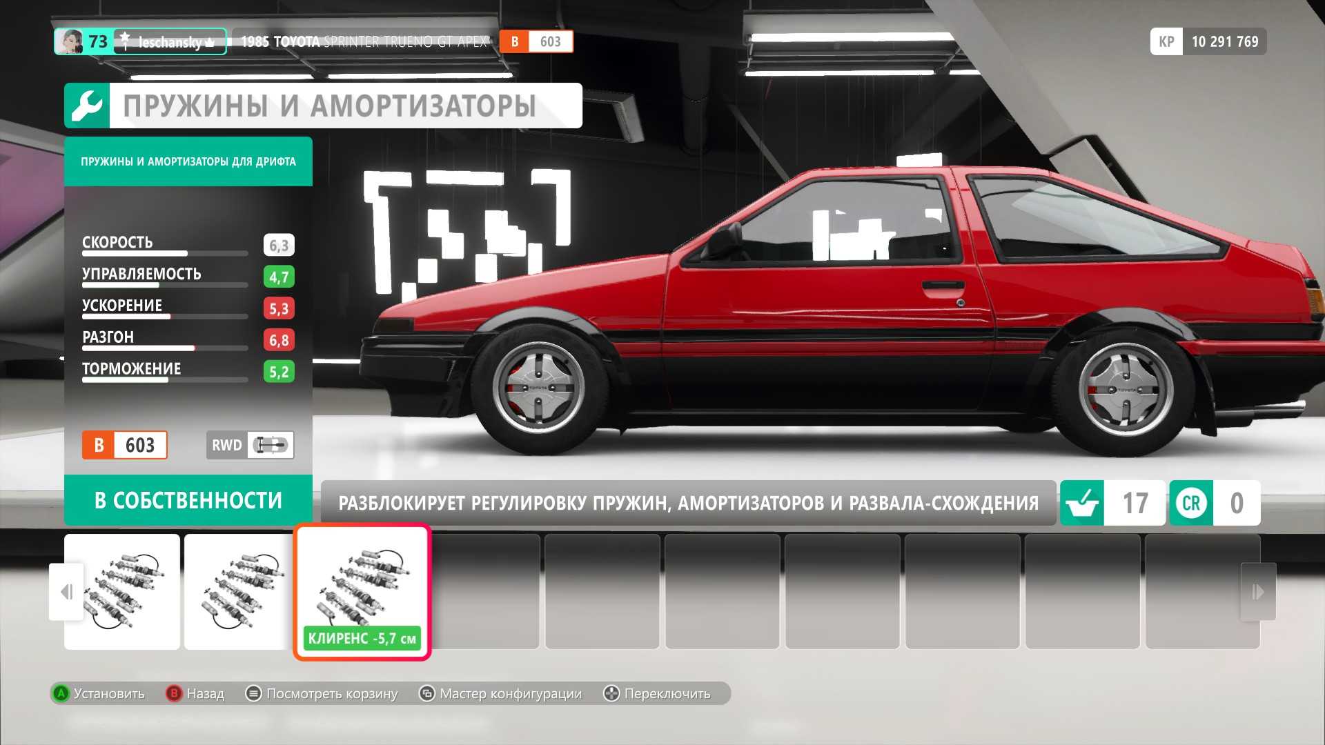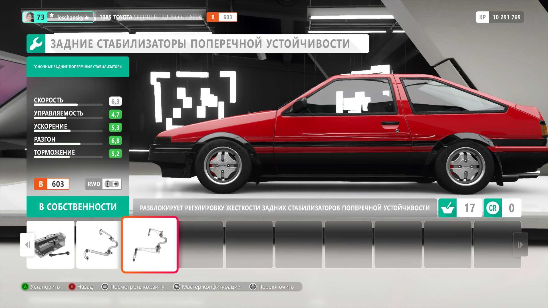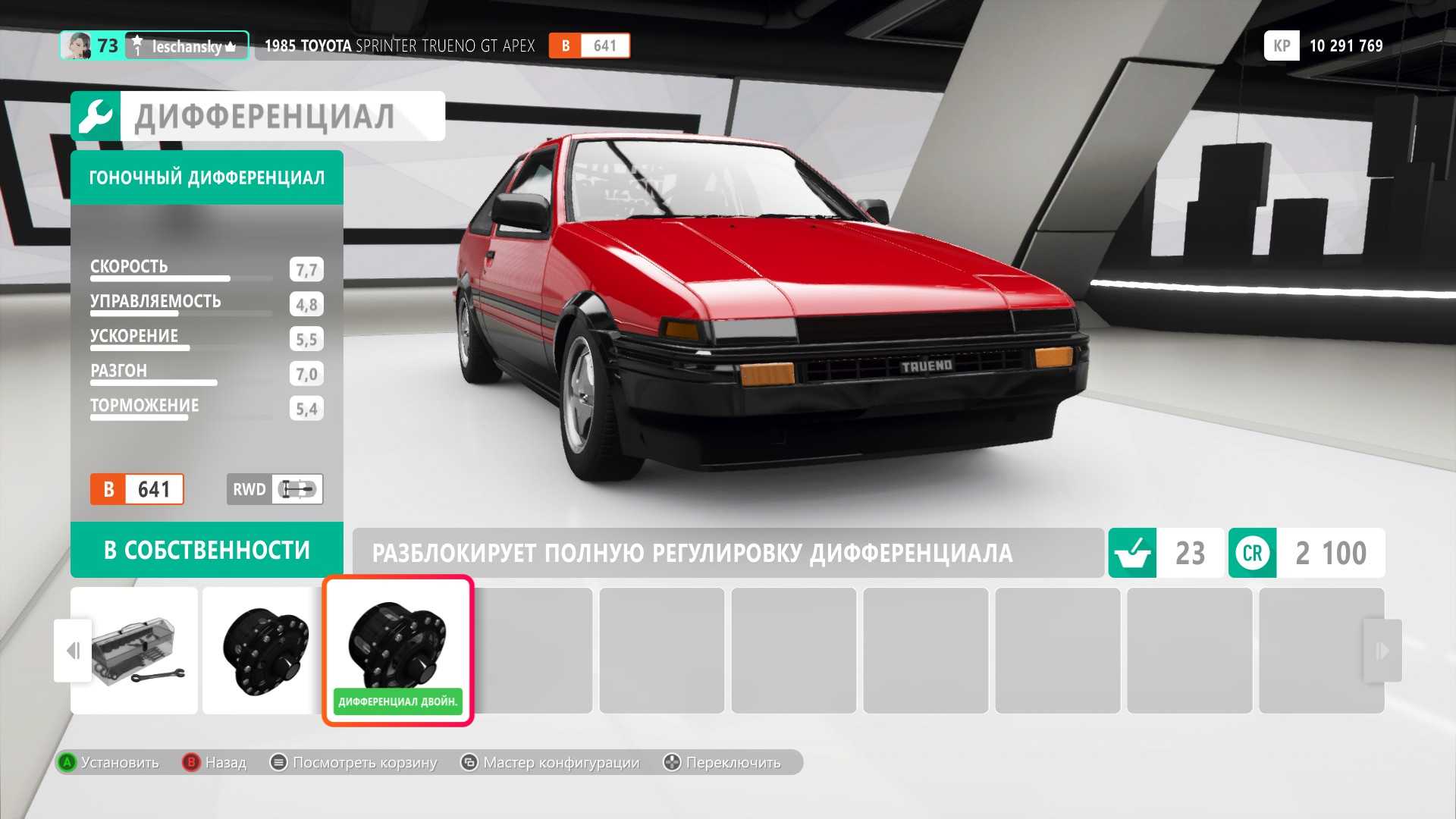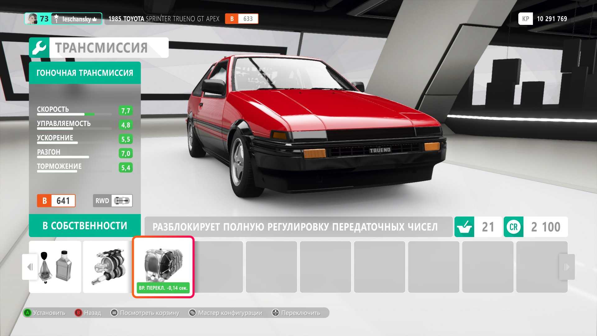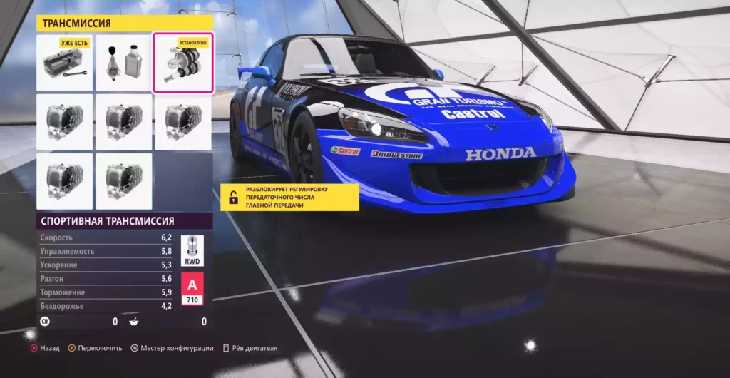 - Гоночная трансмиссия (2400 КР): позволит разблокировать регулировку передаточного числа главной передачи, которая понадобится для тонкой настройки автомобиля;