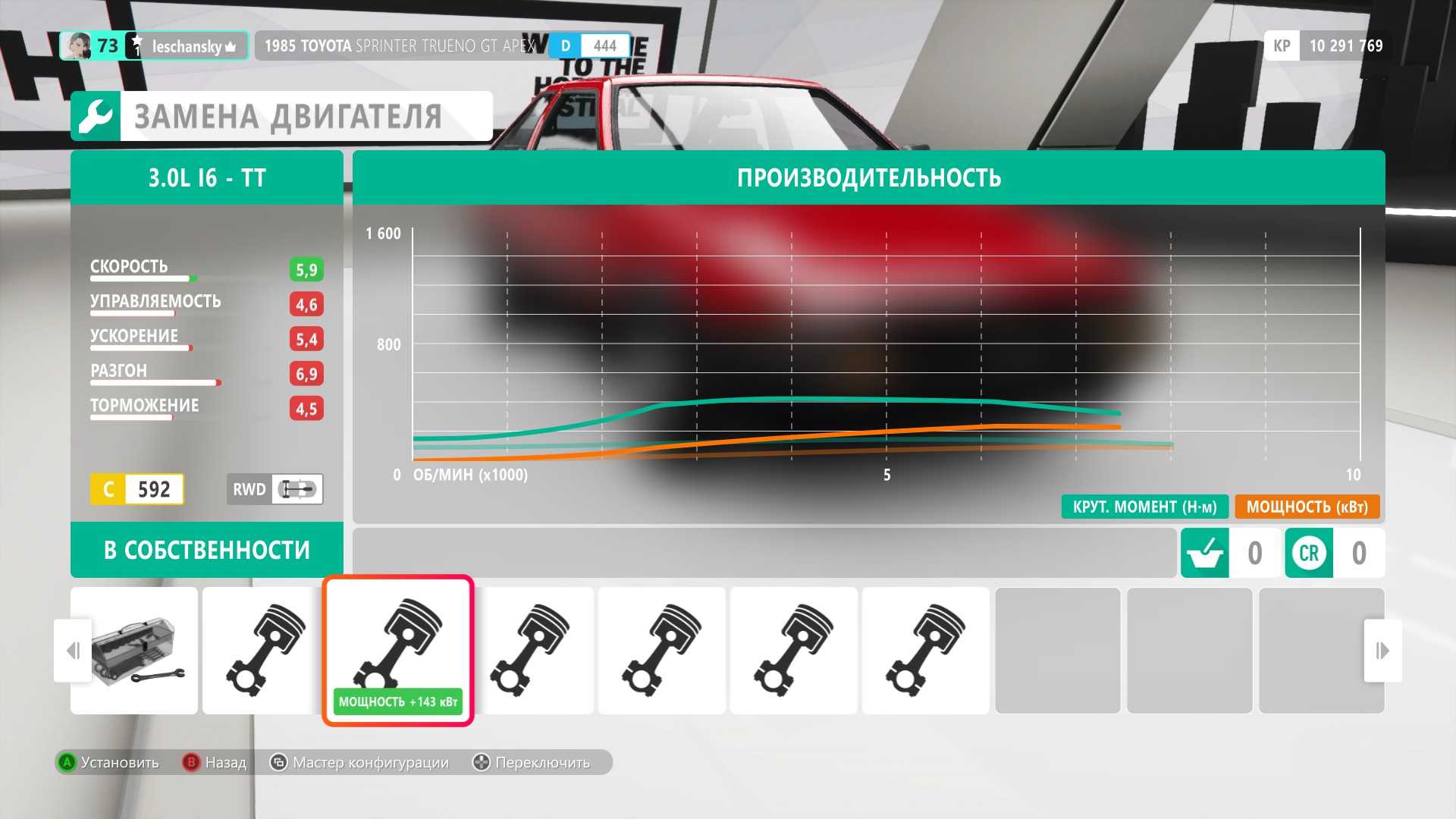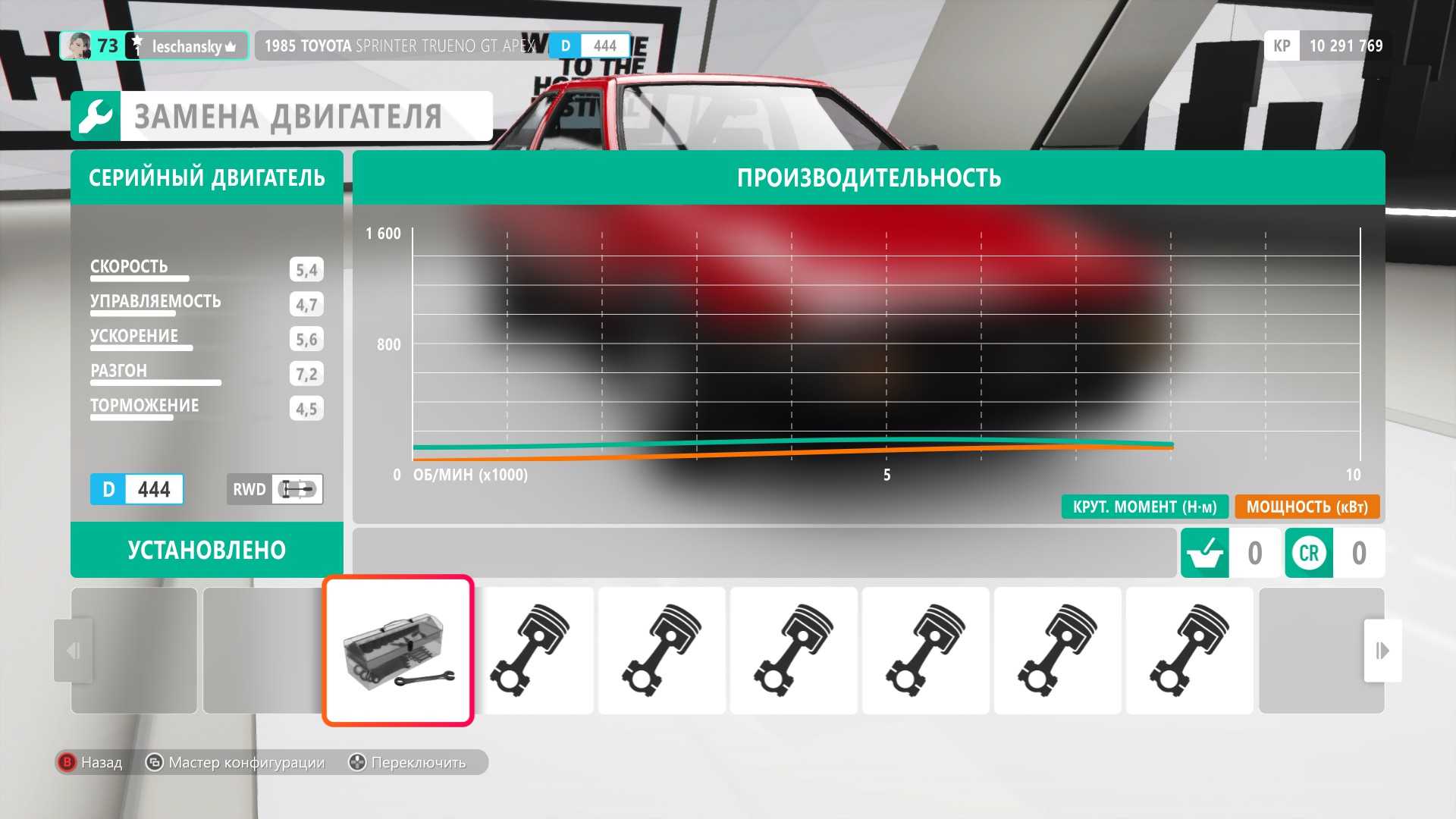 Вот в таких случаях стоит ставить двигатель получше, но в общем-то говоря, никто не будет Вас отговаривать от свапа, если уж прям хочется поменять, но это самая дорогая деталь,хотя не такие уж и большие деньги при возможных темпах заработка в этой игре. Стоковый двигатель Хачироку хорош, машина очень приятна в заносе, поэтому для начала рекомендую именно его, но чтобы дальше графики было видно отчетливее и под капотом жужжало погромче, я поставлю в свою АЕ86 тот самый 2JZ