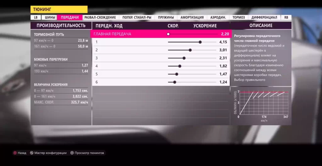 Ползунок главной передачи регулирует все сразу, а остальные ползунки предназначены для конкретных передач. График в правом нижнем углу экрана переключения передач — ваш лучший друг, так как это отличный актив, чтобы узнать, какую часть потенциала вашего автомобиля вы используете. Самое дальнее число по оси X — это теоретическая максимальная скорость автомобиля , и если вы добавили много мощности с помощью обновлений, вы, вероятно, заметите, что ваша самая верхняя передача ( крайняя правая линия) не приближается к нему даже при максимальных оборотах (как на изображенном графике).