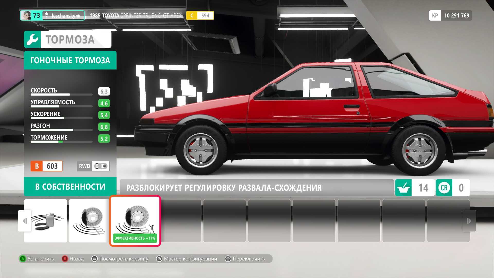 Они нам позволяют распределять тормозное усилие и давление, что нам понадобится для возможности делать перекладки. Не стоит смотреть на надпись чуть ниже центра экрана о развале-схождении — это ошибка локализаторов или разрабов. Развал-схождение дает подвеска. Thanks cap