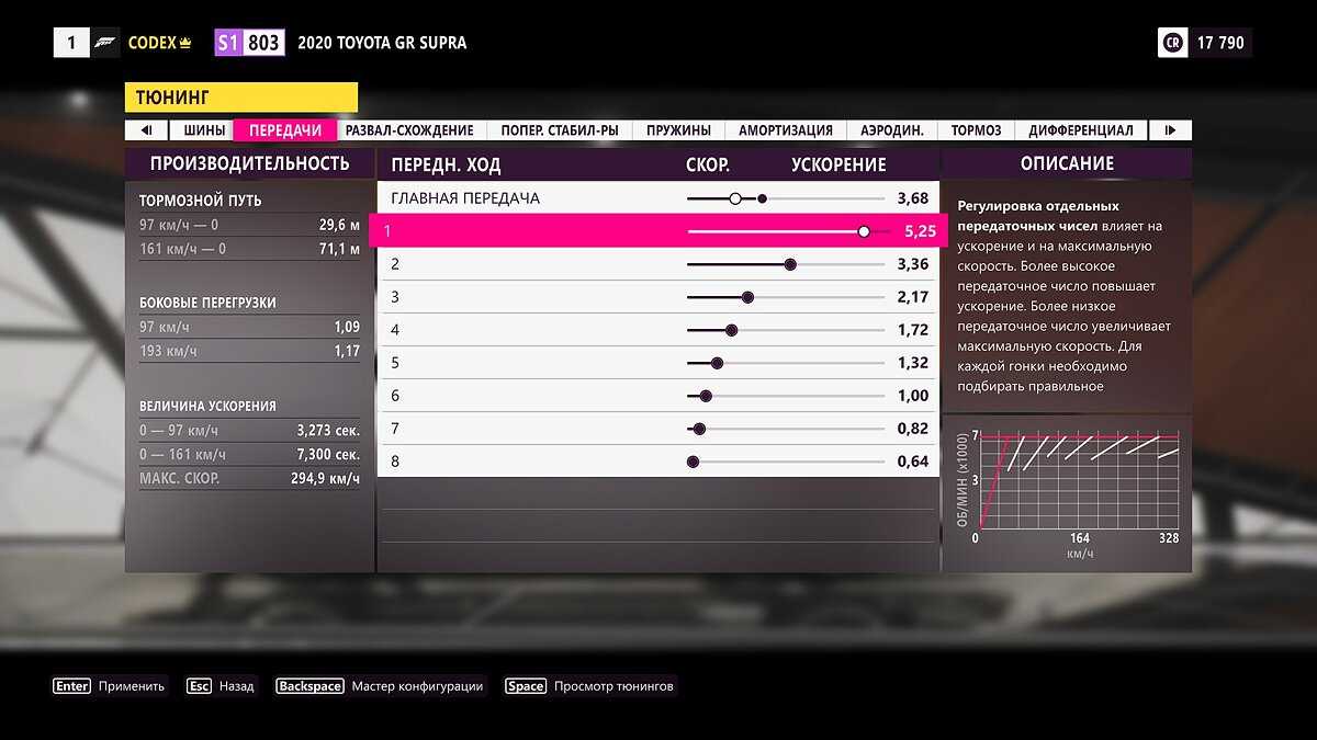 В Forza Horizon 5 появилась возможность покупать гоночную коробку с определенным количеством нужных передач. Если вы не свапали привод машины, то у вас есть опция покупки регулировки главной пары. То есть, только регулировка верхнего ползунка, который растягивает все передачи по кривой мощности. Если привод в машине уже свапнут, то опция покупки только главной пары у вас не будет – она будет регулироваться по умолчанию.