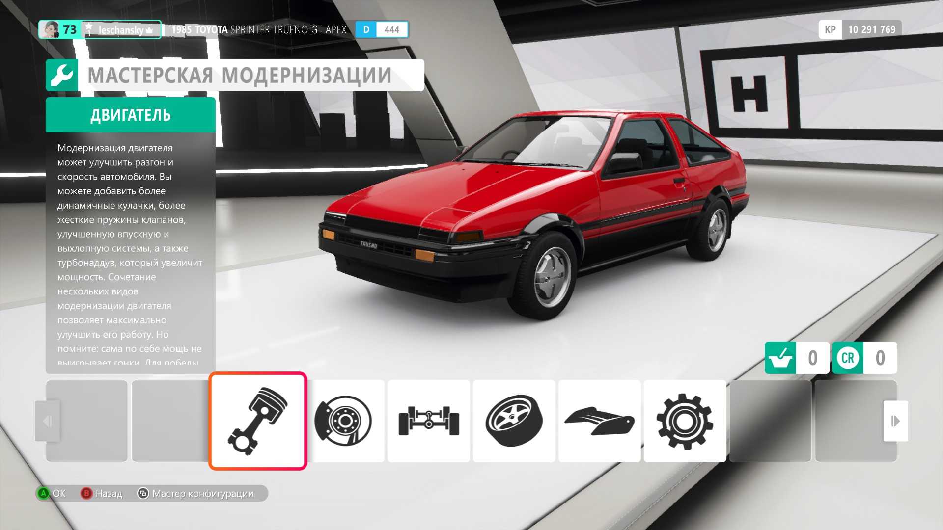 При заходе в мастерскую мы видим перед собой несколько вкладок, внутри которых находятся запчасти, влияющие на параметры автомобиля.