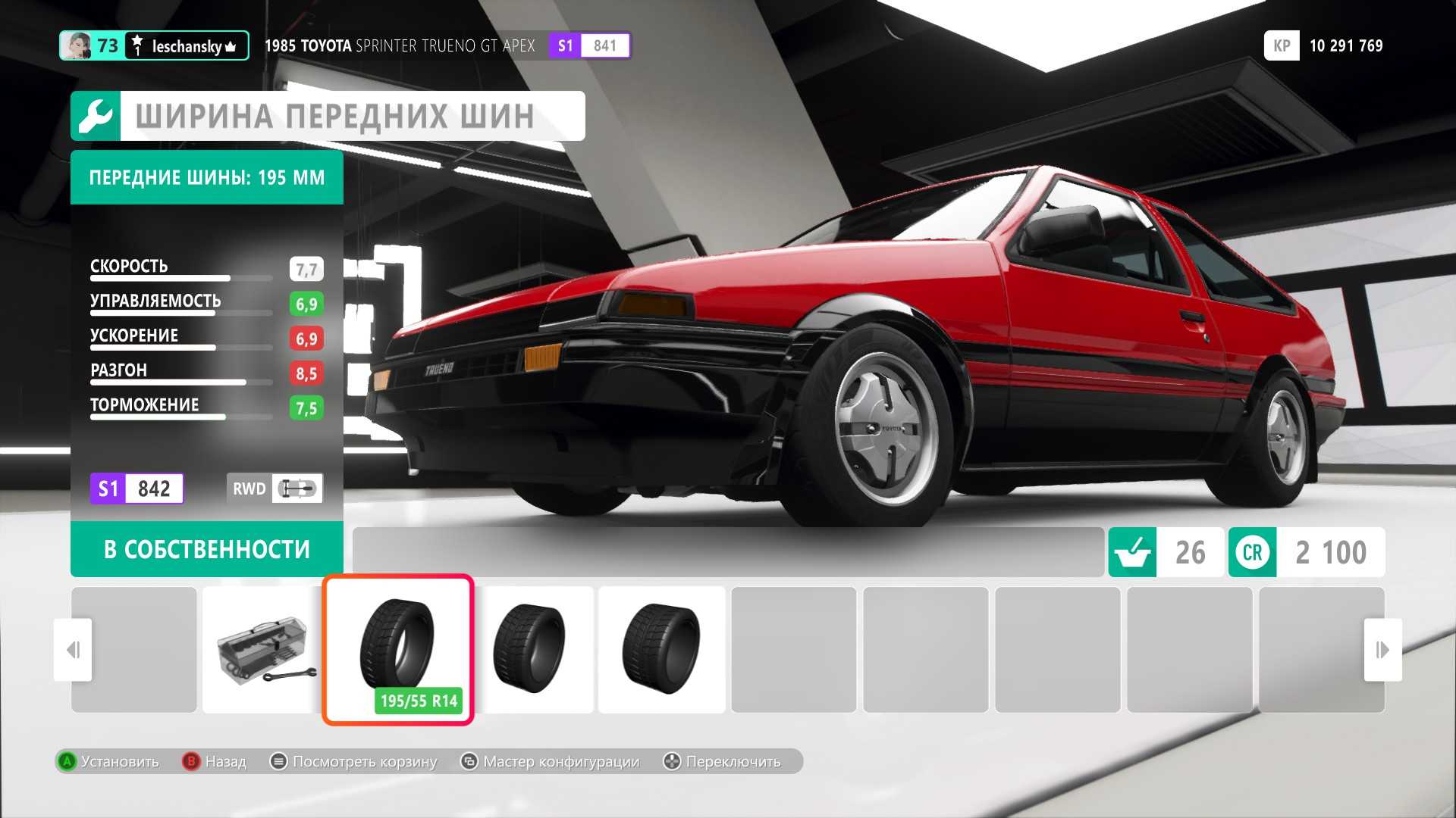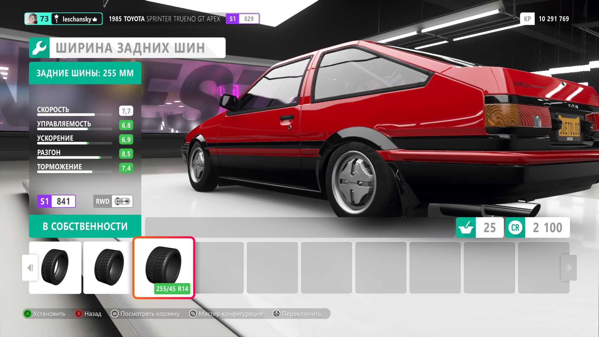 Для этого перейдите в раздел «Пользовательская модернизация» и выберите «Шины и диски». Приобретите следующие детали: