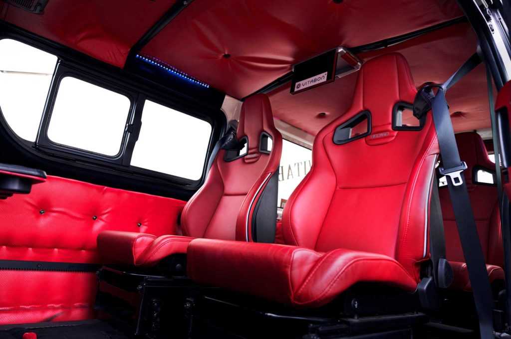 Го-сан признает, что его «GT-R HiAce» превзошел все ожидания. Теперь он хочет поделиться эмоциями с окружающими, и именно поэтому заменил задние ряды сидений на четыре ковша Recaro.