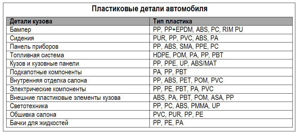 В то время как несколько видов пластика может использоваться в машине, три основных типа составляют 65% всего пластика, используемого в автомобиле: PP — полипропилен (32%), PU/PUR полиуретан (17%) и PVC — поливинилхлорид (16%). Итак, рассмотрим наиболее часто используемые в автомобилях типы пластиков.