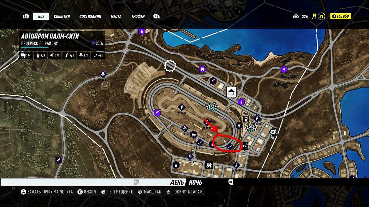 Дневные соревнования довольно разнообразны: кроме кольцевых гонок, по мере прохождения сюжета становятся доступны заезды на время, дрифт, бездорожье и прочие активности. А еще днем хорошо исследовать карту в поисках рекламных щитов и других мест интереса.