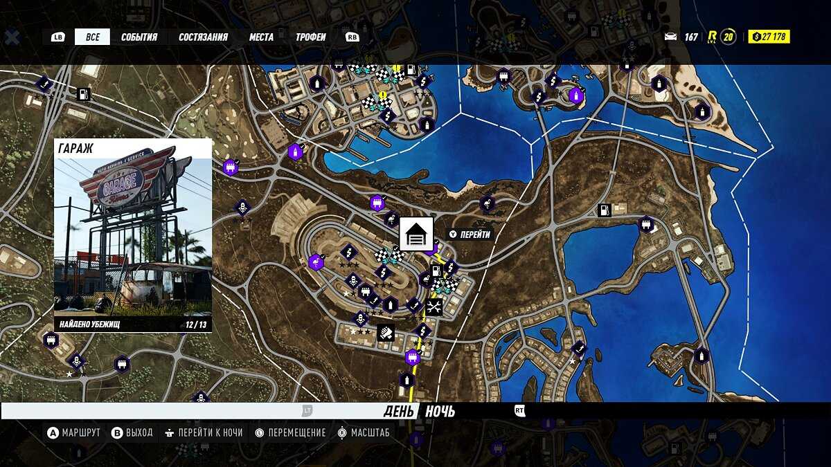 Как и в предыдущих играх серии, вам доступен целый город. Кроме событий, на карте отмечены гаражи, испытания и коллекционные предметы. Как только вы оказываетесь в непосредственной близости от объекта, он помечается на карте.