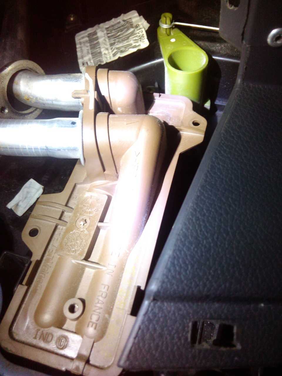 Радиатор отопителя аккуратно извлекается. Крепёж радиатора печки «Рено Логан» снят, и её можно извлечь из ниши
