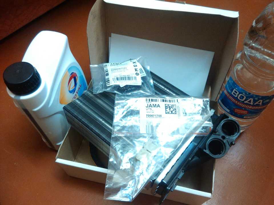 В ходе разбирательства с системой охлаждения/нагревания я пришел к выводу, что для повышения температуры в салоне зимой необходимо заменить печку. Термостат новый (старый вроде как подвисал), антифриз заменен, как тут недавно выяснилось — бачок расширительный целый и без намеков. И воздух спускал неоднократно. Но зимой все равно на мой взгляд недостаточно тепло, особенно читая как у других логан пышет жаром. Решил хоть печку махнуть, может забилась за 8 лет-то.Изначально меня мучила дилемма: провести промывку системы и заменить только печку, или заменить ещё основной радиатор, поскольку у него сломано одно верхнее крепление и герметичность обеспечивает нашлепка из холодной сварки, а за положение в пространстве отвечает стальная проволока-растяжка.Нюанс в том, что при промывке с большой долей вероятности радиатор печки забивается, поскольку имеет наиболее узкие каналы. Так что промывать стоит со старым радиатором печки. Опять же фабричные составы для промывки добавляются в антифриз, что подразумевает его безвозвратную потерю и заливку нового.Но с другой стороны претензий к основному радиатору кроме неэстетичности и нештатности крепления у меня нет, а вот бюджет мероприятия при замене обоих радиаторов стремительно возрастает. Хотя в поездке на юг в волгоградских пробках пару-тройку раз температура ползла на 6 делений, там и было за 35’C. Грешу на шубу между радиаторами кондера и основным, тем более что расстояние между ними мизер — радиатор кондера вмят внутрь. Надо снимать бампер, разбирать их и смотреть что там, промывать. Судя по видео, просмотренному сегодня, кондерный крепится к основному двумя торксовскими винтами со стороны бампера.А сегодня мучая поиск на логан.ру я наткнулся на интересную мысль — при замене печки не нужно сливать антифриз, а надо просто зажать патрубки. Гениально! Самый тупой и простой вариант, как раз для меня, тем более что есть чем зажимать.Получил заказанный радиатор, клипсу взамен поломанной для облицовки стойки, прикупил по дороге литр антифриза и бутыль дистиллята.