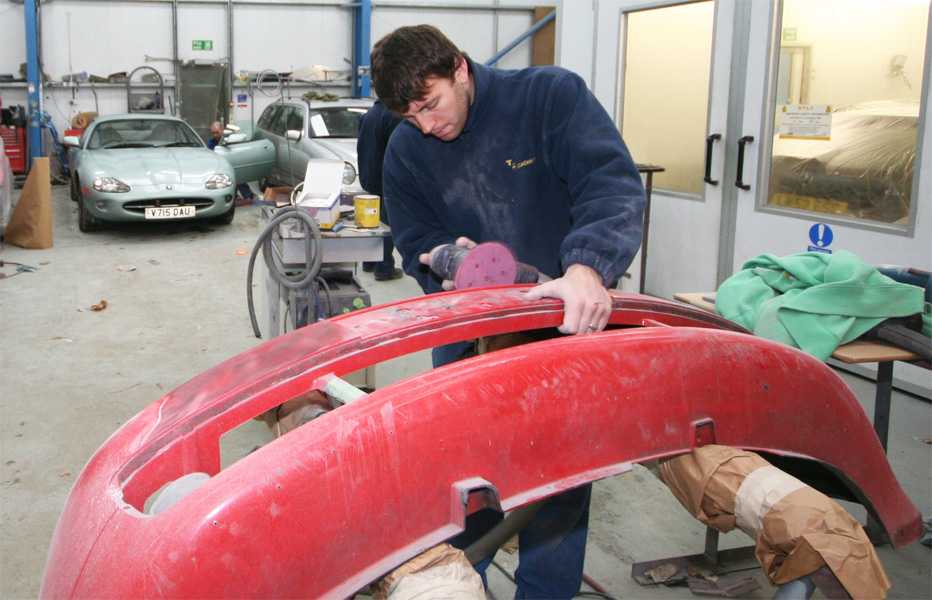 Когда шпаклёвка затвердеет, весь бампер можно начать обрабатывать шлифовальной машинкой. Шлифовку стоит осуществлять максимально аккуратно, дабы не испортить сам бампер. Особенно внимательно следует зачищать и заглаживать уголки, сколы, и сам шов. Там, где не удастся пройтись машинкой, можно работать вручную (наждачной бумагой).