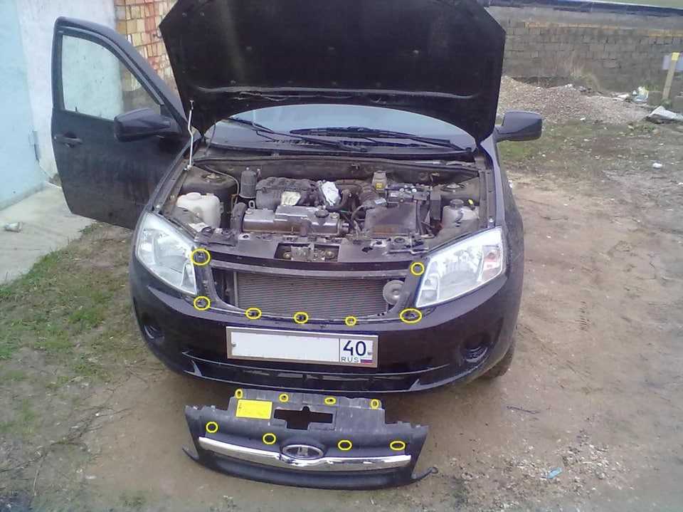 Рекомендуем проводить действия с напарником. Помощник сможет удержать одну часть, в тот момент пока вы отвинчиваете фиксаторы с переднего бампера калина. Самостоятельные действия не гарантируют качество и безопасность процесса.
