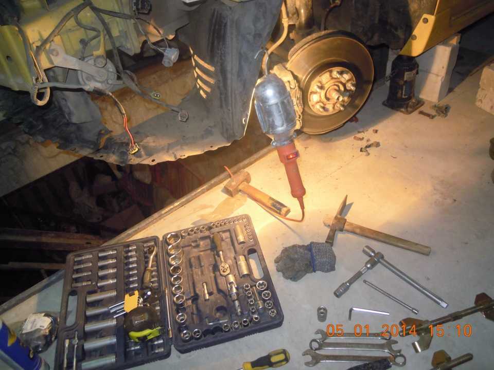 После этого приступаем к снятию стойки вместе с поворотным кулаком (можно было снять просто стойку целиком без поворотного кулака но я сделал так) для этого нужно открутить шрус наружный, шаровые, рулевые наконечники, стойку стабилизатора, и не забываем отсоединить штекер датчика АБС (как видно на фото он уже перемотан изолентой его просто напросто оторвали видимо, это дело я размотал и припаял концы и все заизолировал по новой.)
