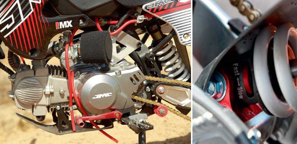 Двигатель JMC 140MX —технологичный родственник легендарного Honda Super Cub. Задний амортизатор оснащен всеми необходимыми регулировками.