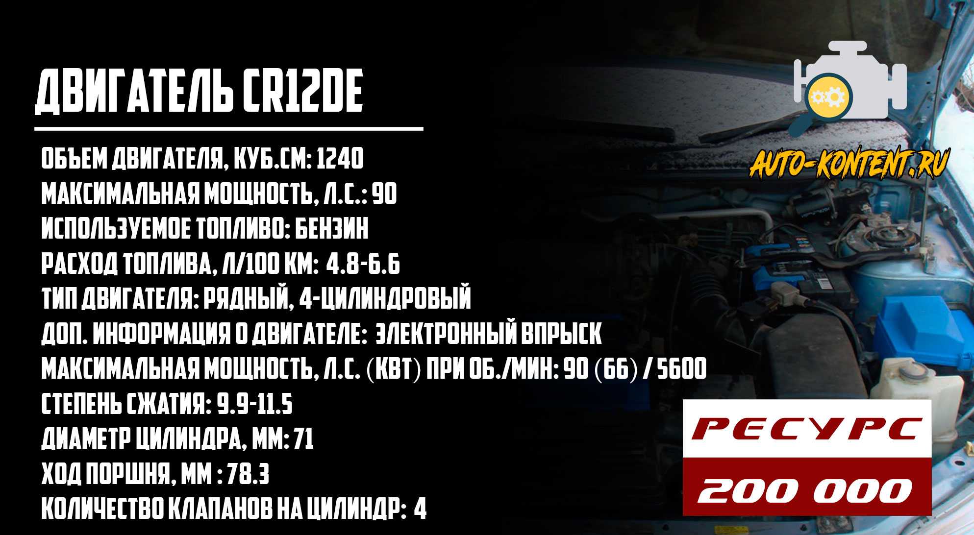 Первое время в этом моторе быстро растягивалась цепь ГРМ, но после производитель доработал и устранил этот недостаток. Так ресурс цепи подрос до солидных 180-200 тыс. км. На первых версиях двигателя водители часто отмечали пробой прокладки головки блока цилиндров. Пробой мог привести к серьезным последствиям и поломки двигателя. Двигатель не переносит топливо плохого качества, нужна периодическая чистка форсунок. Также от автовладельцев можно услышать многочисленные жалобы на нестабильную работу движка в зимнее время или вовсе отказ ДВС от функционирования. Но самая большая проблема мотора CR12DE это прогрессирующий масложор. Как только начался расход масла, следует готовиться к тому, что вскоре этот показатель достигнет критических значений. Двигатель слабо поддается ремонту, поэтому зачастую автомобилисты подыскивают контрактные варианты.