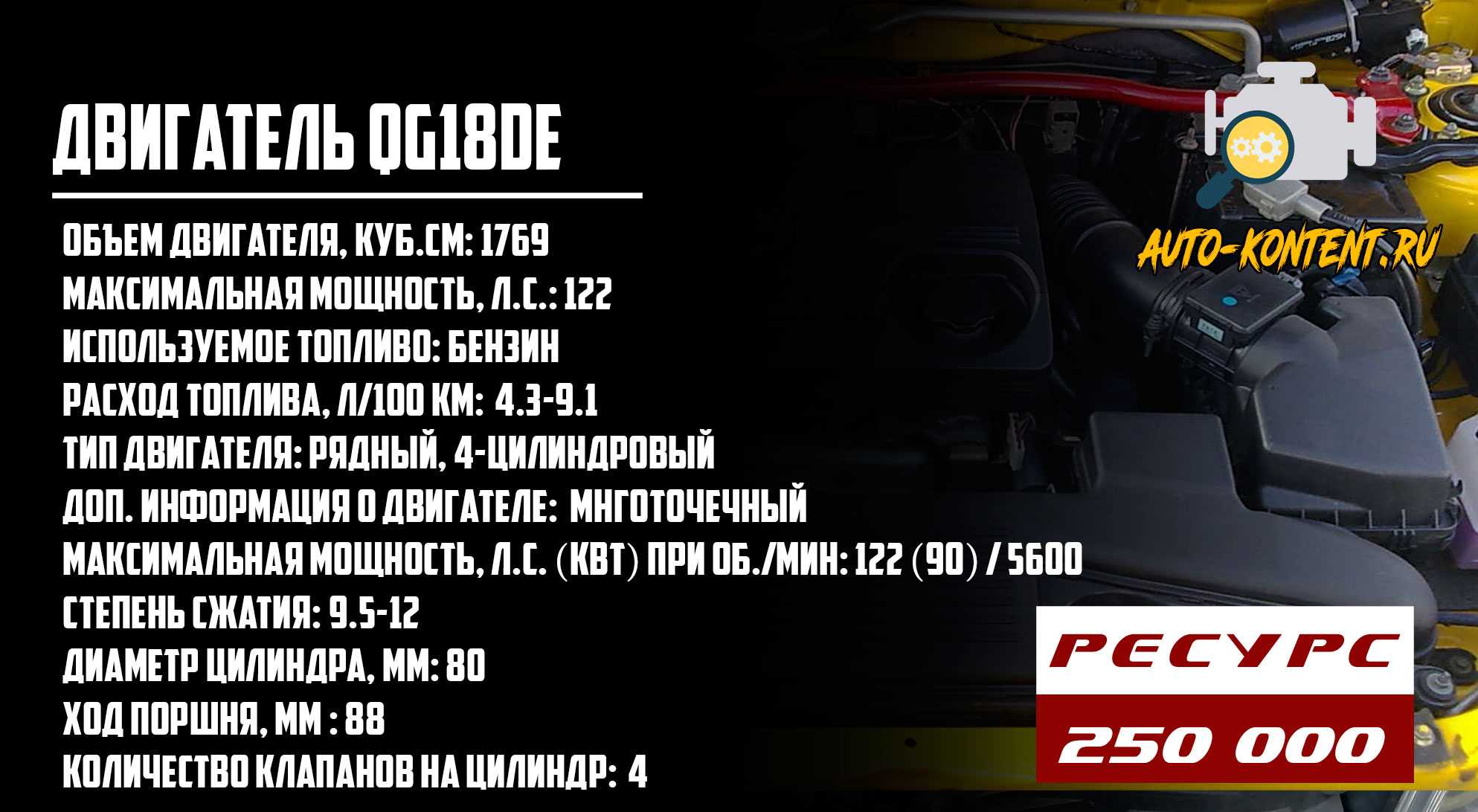 - QG18DEN – в отличие от предыдущего собрата, этот мотор уникален тем, что работает на природном газе. Получил широкую популярность благодаря экономичному ценнику заправляемого топлива. Рабочий объём всех четырёх цилиндров составляет 1769 см³, максимальная мощность – 105 л.с. расход топлива составил 5,8 на 100 км пути.