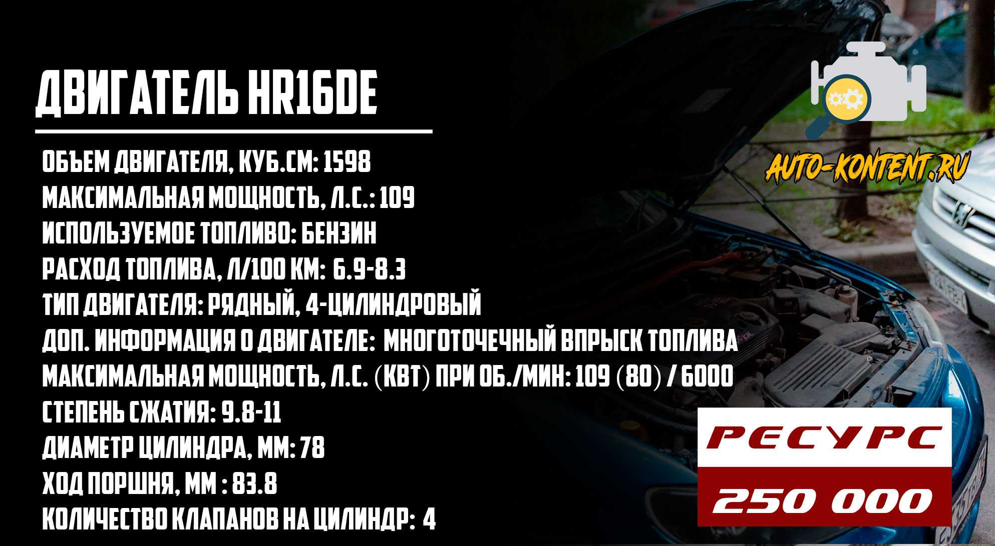 - HR16DE – это модернизированный собрат предшественника, от предыдущего отличается объемом – у него он составляет 1598 см³. Благодаря большему объёму камеры сгорания мотор способен развивать большую мощность – до 150 л.с. Повышение мощности отразилось на расходе топлива – двс кушает от 6,9 до 8,3 л на 100 км. Устанавливается силовой агрегат также на некоторые модели mazda familia с 2007 года.