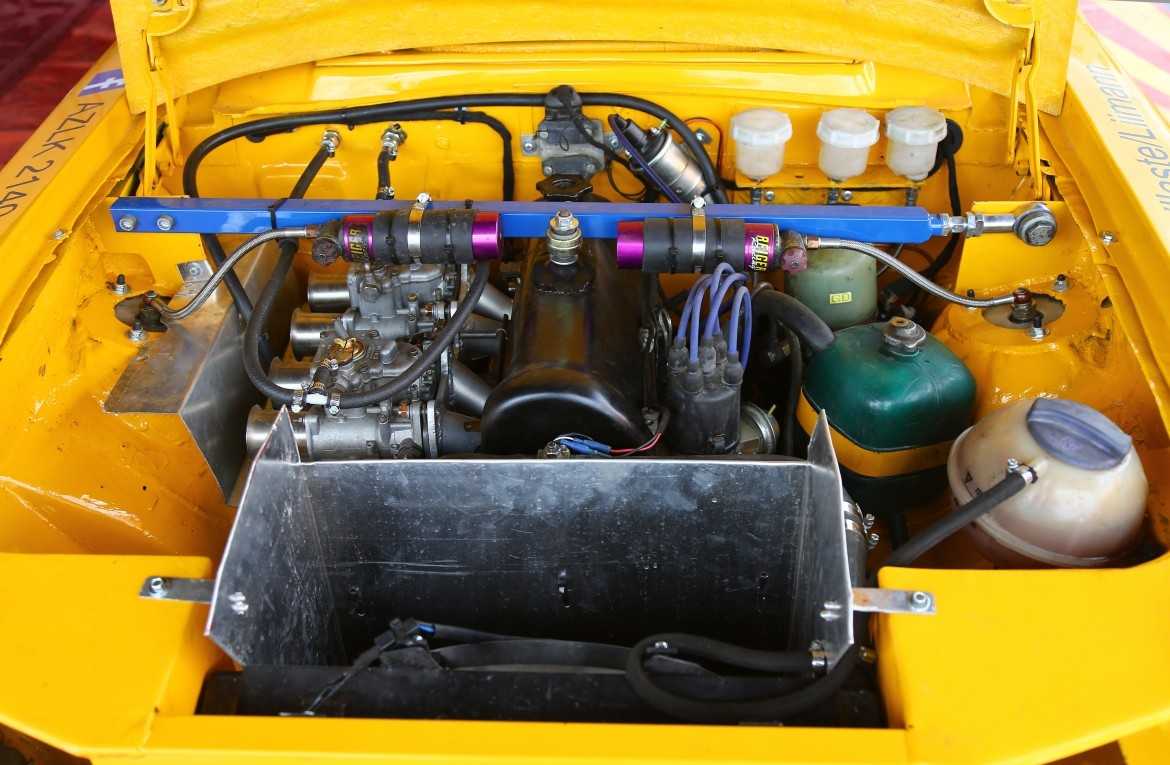 Головка блока цилиндров — с увеличенными клапанами (для пропускания большего количества топливовоздушной смеси в цилиндры) и распределительным валом, выполненным на заказ, с более широкой фазой работы, направленной на повышенные обороты. А для лучшего смешивания топлива и воздуха здесь установлены сдвоенные горизонтальные карбюраторы Weber DCOE 45, впускной коллектор под которые естественно пришлось сконструировать самостоятельно. В системе охлаждения трудятся увеличенный двухрядный радиатор и электрический вентилятор. Таким образом, все слабые узлы ВАЗовского мотора усилены или заменены на более прочные тюнинговые детали. Для быстрого выхода двигателя на максимальные обороты используется облегченный маховик, крутящий момент от которого передает на кулачковую КПП диск сцепления с органическими накладками большей площади. В такой конфигурации двигатель выдает порядка 150 лошадиных сил (вместо заводских почти 80-ти), что в свою очередь позволяет достойно соперничать с другими представителями класса с моторами объемом до 1.6 литра.