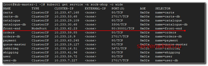 Нас интересует тип NodePort, так как к нему можно подключаться из вне. Видим, что порт используется 30001 и имя приложения front-end. Посмотрим, где оно запущено.