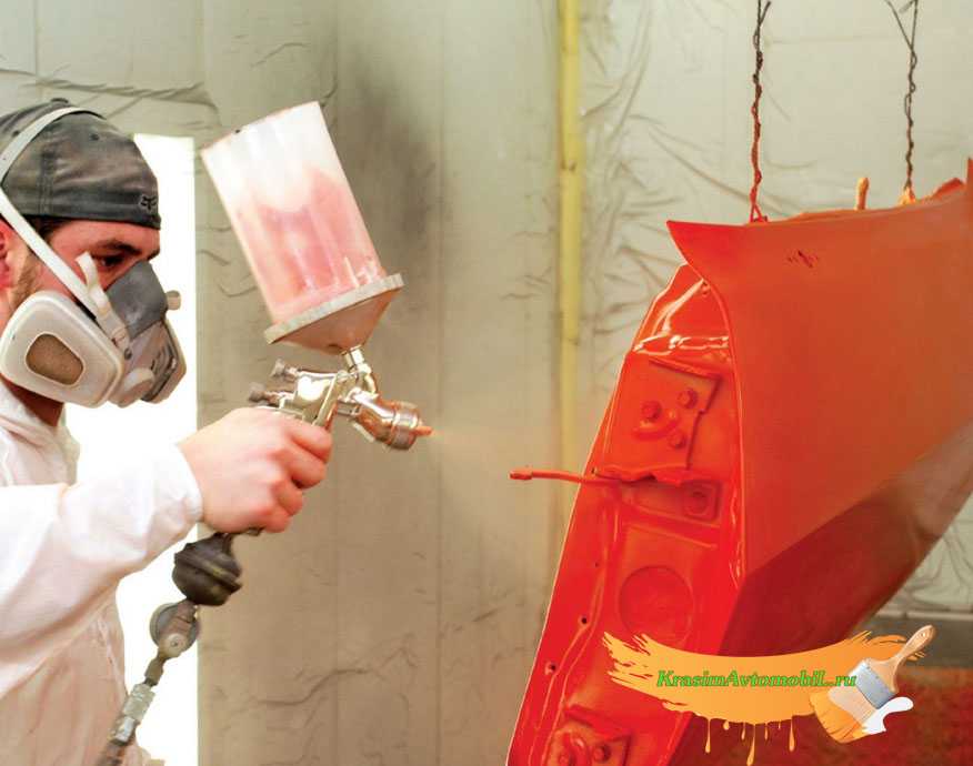 Отремонтированную и обезжиренную поверхность окрашивают в 2-3 слоя с промежутком в 10-15 минут. Краскопульт нужно настроить на узкий факел. Первый слой наносится с близкого расстояния, а последующие – при постепенном удалении краскопульта. Смысл заключается в том, чтобы максимальный слой краски пришелся непосредственно над повреждением.