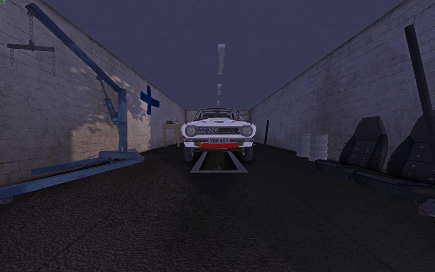 Машина полностью собрана, заправлена и готова к использованию. На счету у вас 500 000 финских марок. Детали двигателя и КПП не изношены. Установлен пользовательский скин. Машина настроена на максимальную скорость (передаточное число 3.700). Получены номера, которы лежат на полке в гараже.