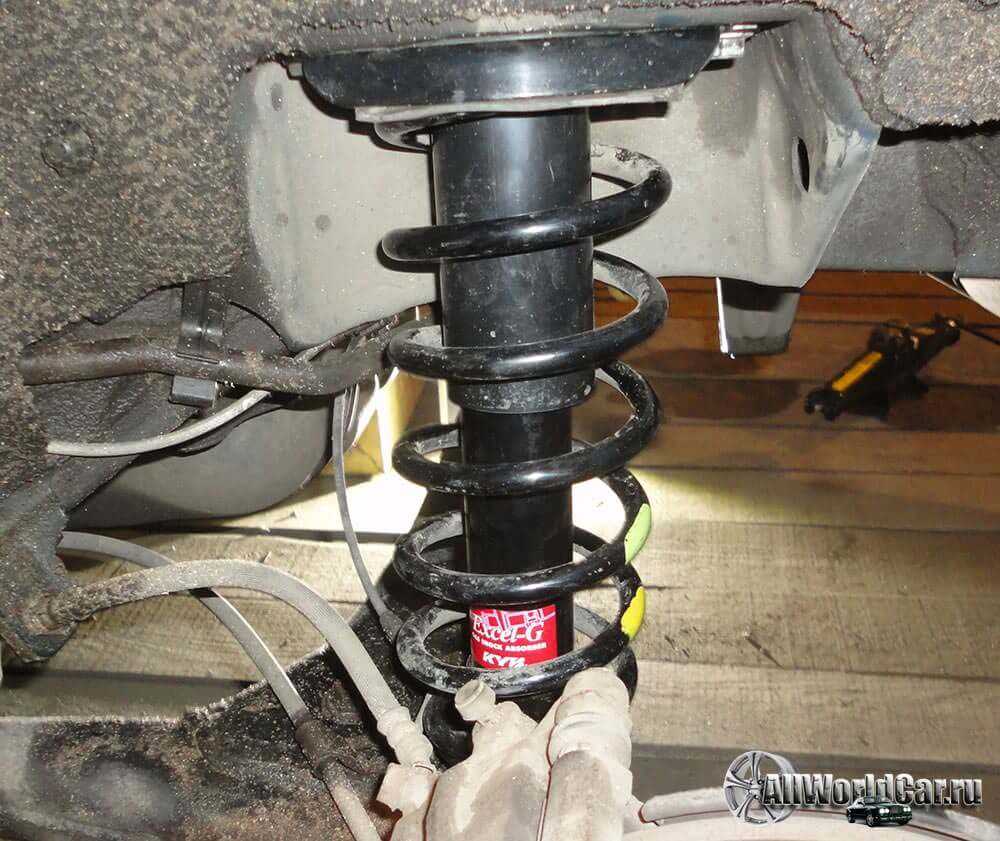 Теперь необходимо всё собрать в обратной последовательности, так как резинки остались старые там уже продавилось место для пружины, так что запоминать положение нет необходимости, всё собирается просто и быстро. Гайку штока амортизатора сильно не затягиваем, окончательно затягивается она когда автомобиль уже будет стоять на обоих колёсах. Поэтому замена амортизаторов производиться одновременно, левый и правый.