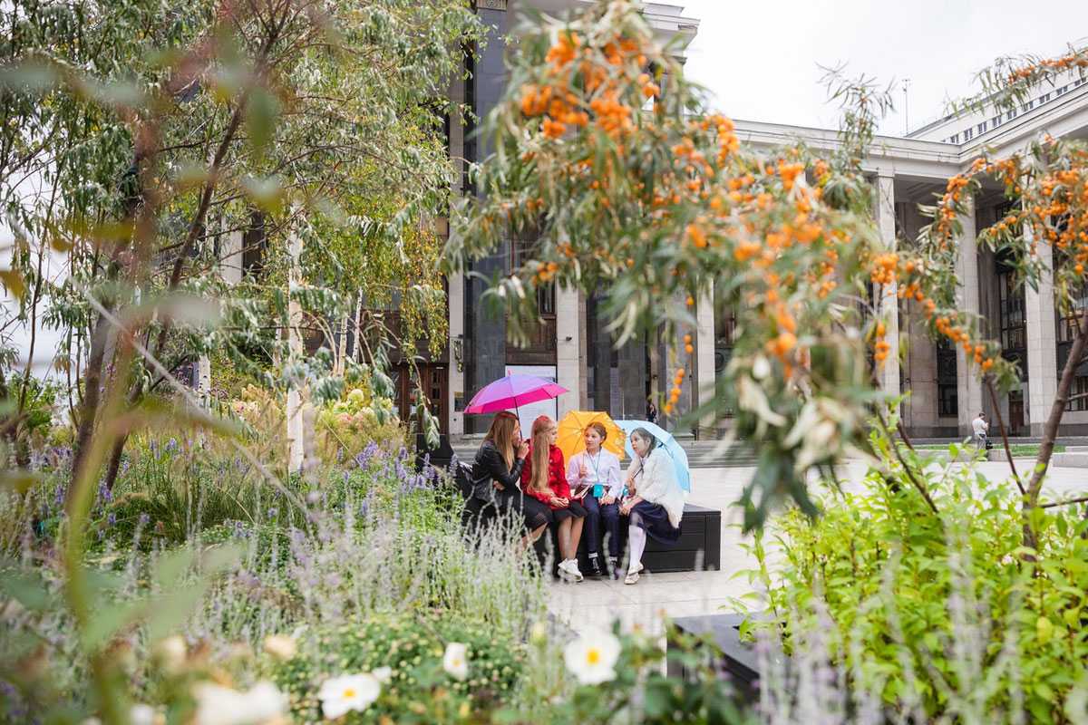 Уютный сад из деревьев и кустарников можно наблюдать у входа главной библиотеки столицы. Здесь можно отдохнуть в специально отведенных зонах и сделать красивые фотографии.