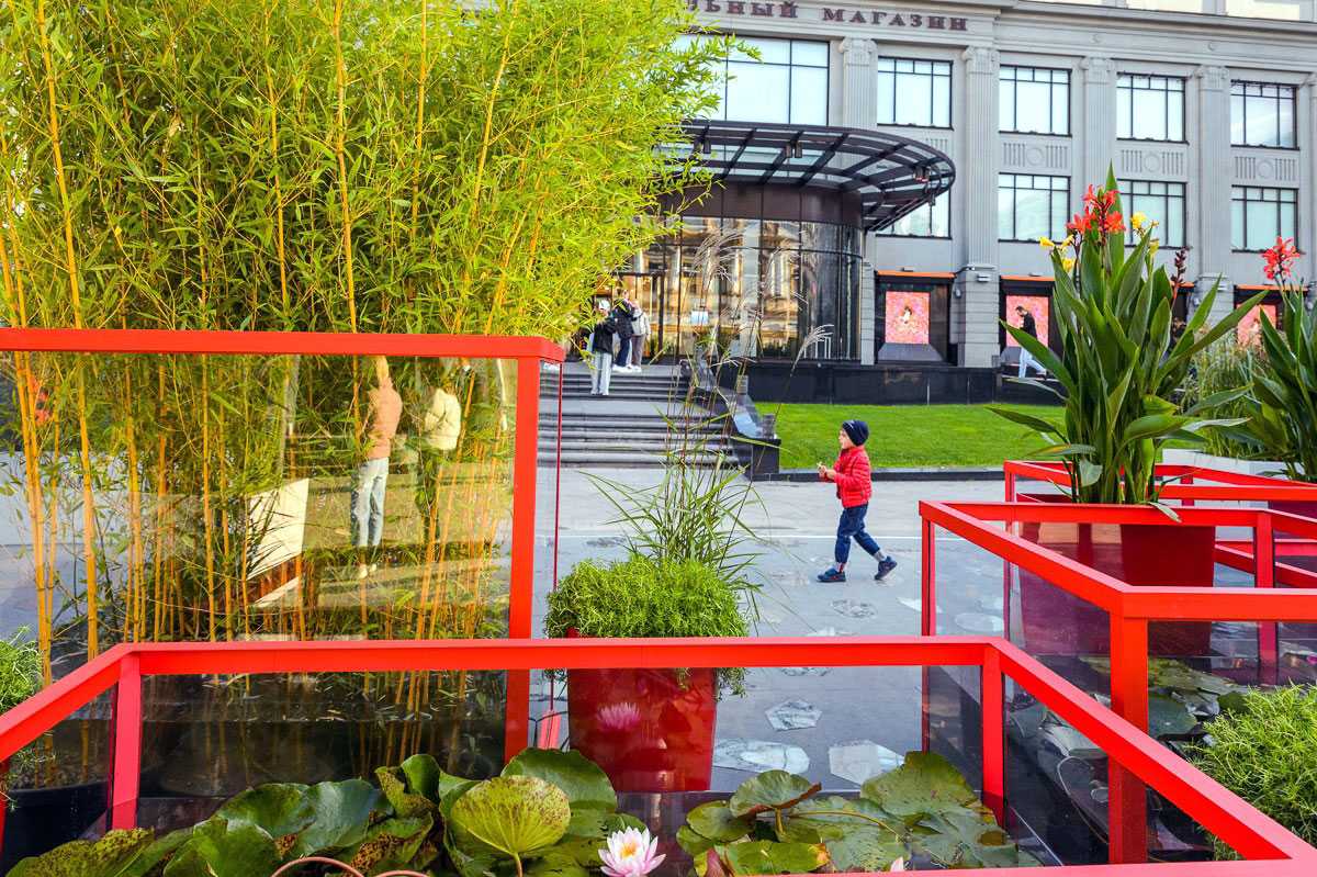 Прямо напротив центрального входа в ЦУМ расположился садик с водными лилиями. Небольшая площадка фестиваля выполнена в форме рыбы. По краям высажены бамбук, ива, тростник и многообразие цветущих растений. Ну а центральную часть занимают несколько аквариумов с водными растениями и цветами.