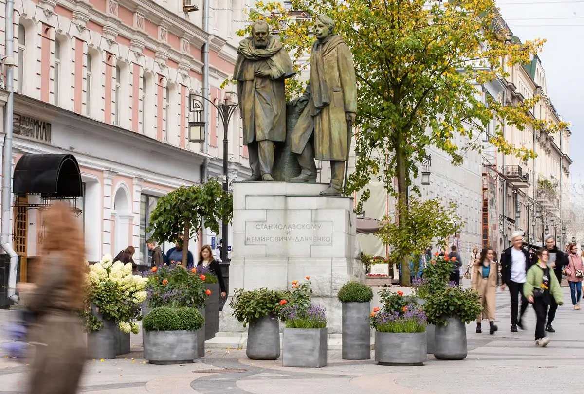 А у памятника К.С. Станиславскому и В.И. Немировичу-Данченко – там же, в Камергерском переулке, разбили целый цветник – декорировали памятник, так что памятник расцвёл в прямом и переносном смысле.