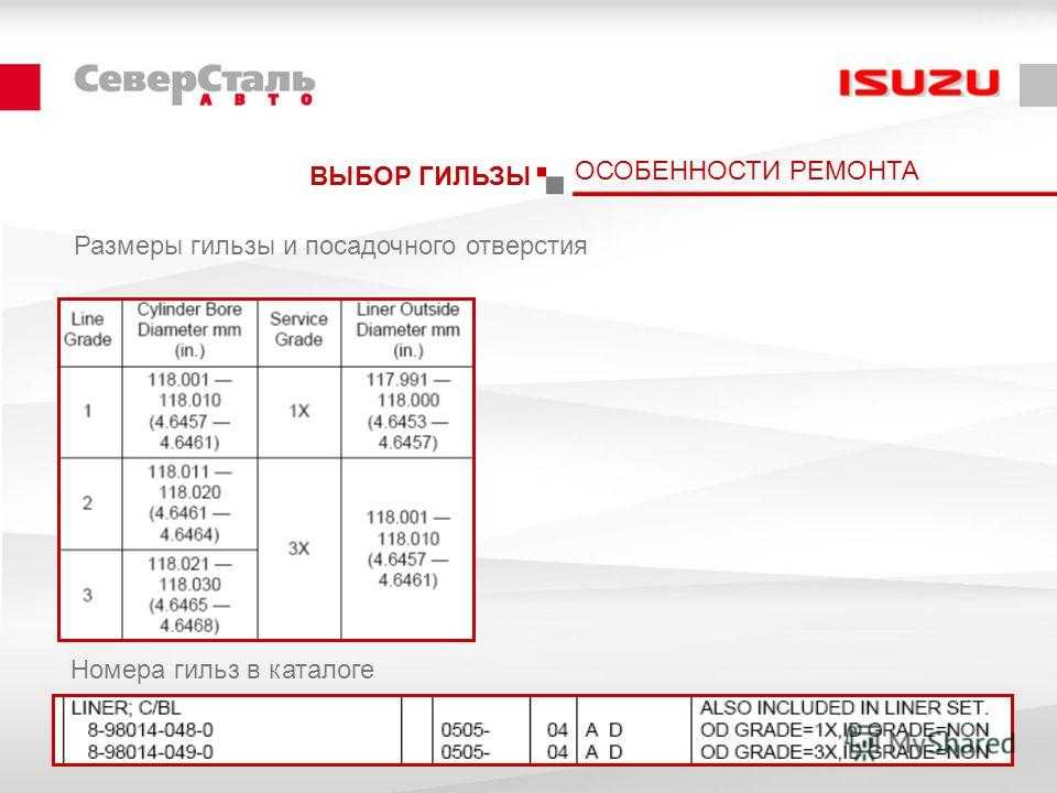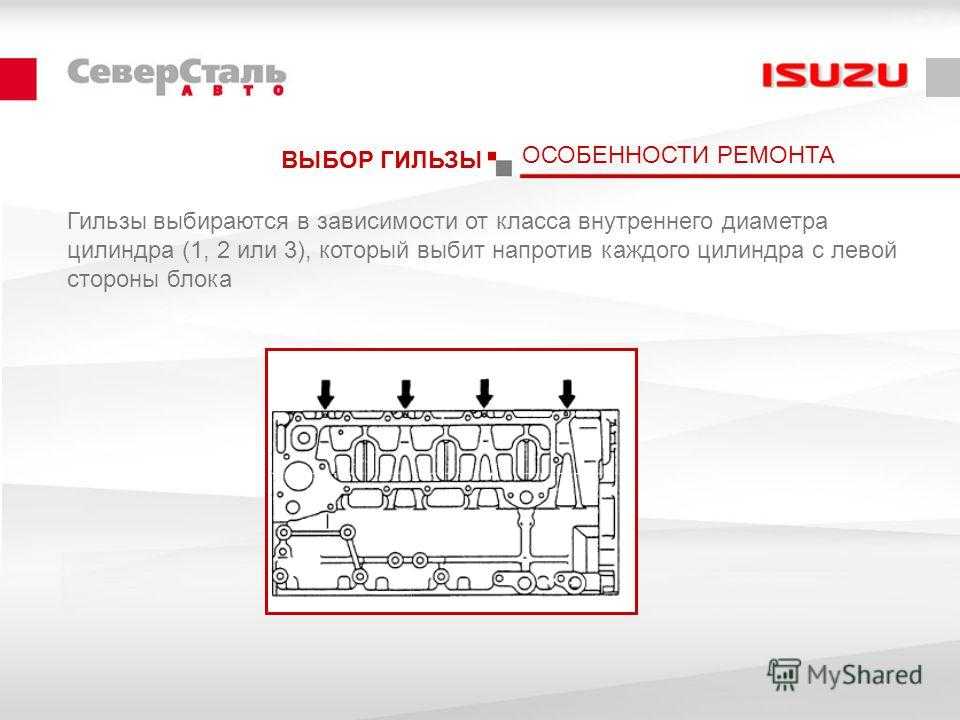 ВЫБОР ГИЛЬЗЫ Гильзы выбираются в зависимости от класса внутреннего диаметра цилиндра (1, 2 или 3), который выбит напротив каждого цилиндра с левой стороны блока ОСОБЕННОСТИ РЕМОНТА