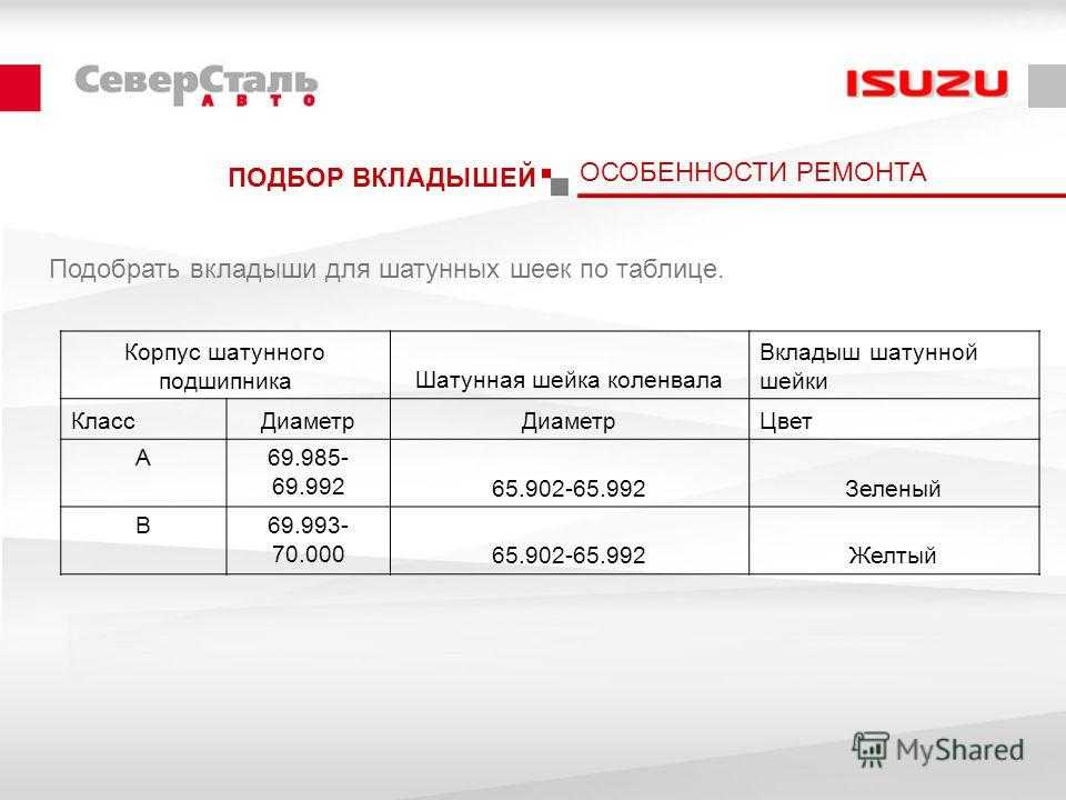 ПОДБОР ВКЛАДЫШЕЙ Корпус коренного подшипника Коренная шейка коленвала 3 Вкладыш коренной шейки Номер класса ДиаметрНомер класса ДиаметрЦвет Черный 281,901-81,910Коричневый Синий 281,901-81,910Черный Подобрать вкладыши для коренной шейки 3 по таблице. ОСОБЕННОСТИ РЕМОНТА