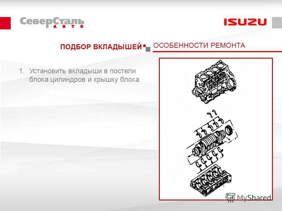 Презентация на тему ДВИГАТЕЛЬ 4HG1-T ОСОБЕННОСТИ РЕМОНТА. ПОДБОР ВКЛАДЫШЕЙ 1. Установить вкладыши в постели блока цилиндров и крышку блока ОСОБЕННОСТИ РЕМОНТА. Транскрипт
