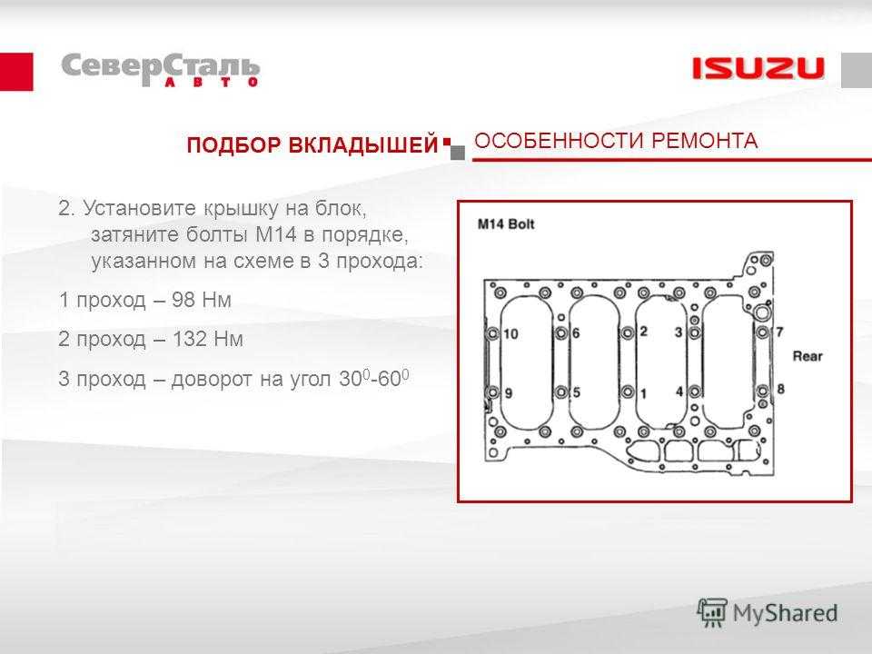ПОДБОР ВКЛАДЫШЕЙ 2. Установите крышку на блок, затяните болты М14 в порядке, указанном на схеме в 3 прохода: 1 проход – 98 Нм 2 проход – 132 Нм 3 проход – доворот на угол ОСОБЕННОСТИ РЕМОНТА