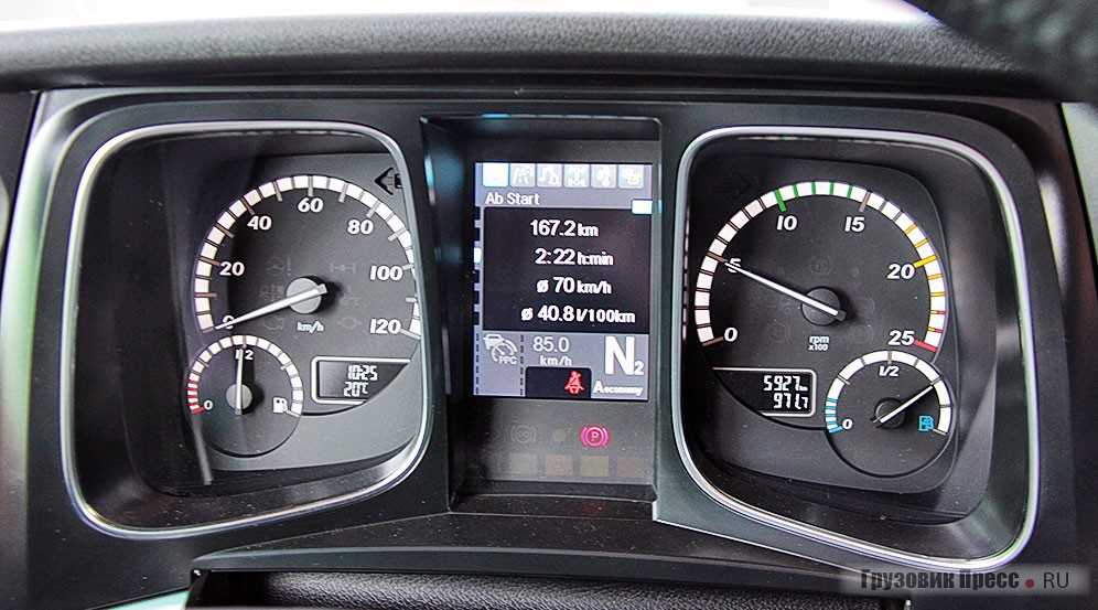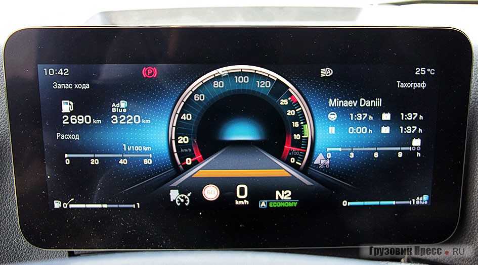 Электронный ключ и автомобиль узнали друг друга и поприветствовали, лукаво подмигнув оптикой. Больше не надо вставлять ключ ни в какой слот, просто принести его с собой. Настраиваю под себя приборную панель. Сначала выберу индикацию периферийных данных (по центру диаграмма стрелочного спидометра, совмещённая с тахометром), пусть это будет привычное мне давление воздуха, ещё добавлю на главный экран информацию тахографа и выберу в меню русский язык. Снизу по умолчанию индицируется информация о запасах топлива, синтетической мочевины и трип-данные поездки. Позже, в процессе детального знакомства, я ещё буду несколько раз менять области выводимых данных, забавы ради и информации для.