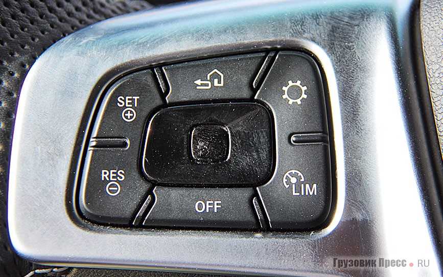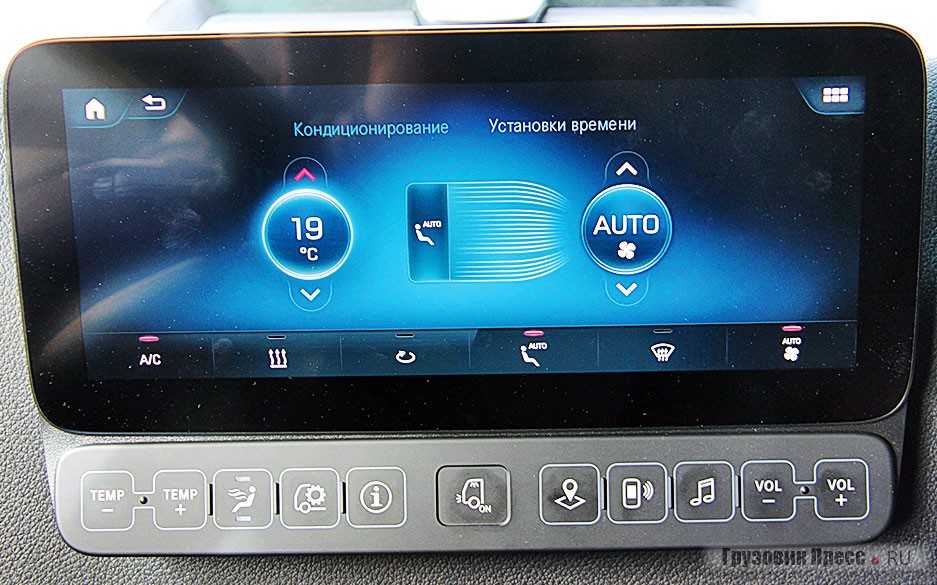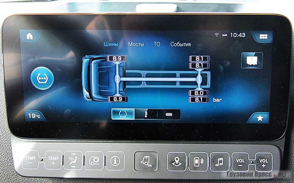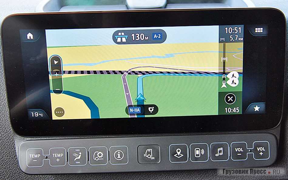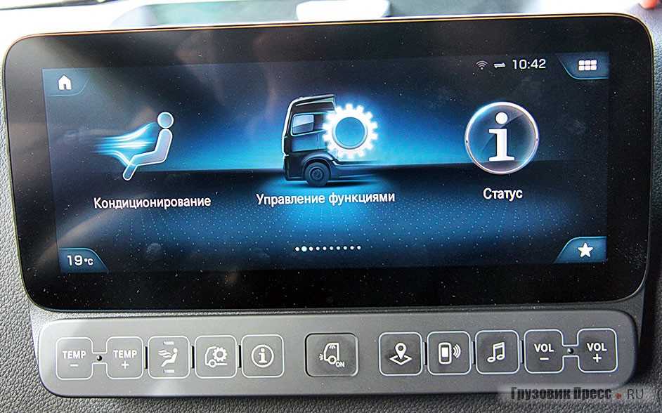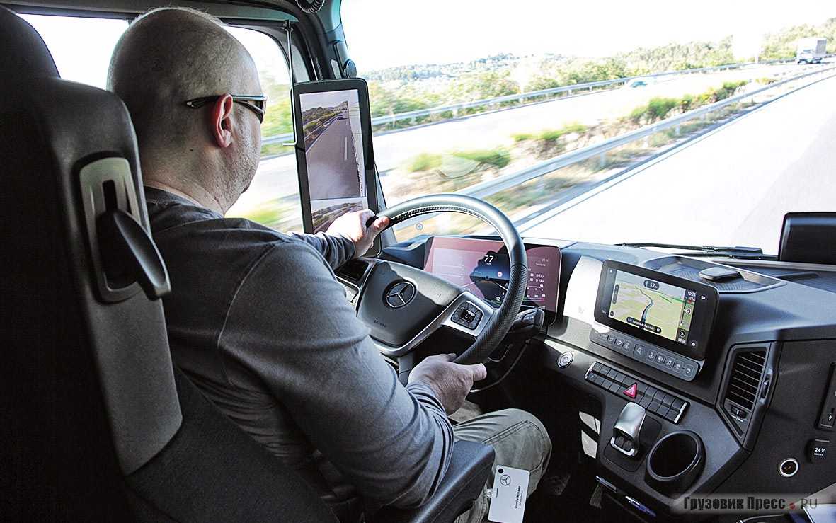 Управлением меню виртуальной приборной панели заведует блок кнопок на левой спице рулевого колеса, регулировка зеркал и вовсе на привычном месте в дверной карте, а правый планшет предпочитает тактильное общение. На нём три группы областей данных: климат, настройки и статус. С климатической установкой всё понятно, выбираю комфортную температуру и зоны обдува. В меню настроек я включаю свет, при этом на экране появляется изображение тягача, на котором сияют задействованные световые приборы, это буквально радует и умиляет, провоцируя поиграть ещё! Кстати, грузовик в тёмное время суток умеет сам определять, когда переключить дальний свет на ближний. Ещё на этом планшете я обнаружил индикацию осевых нагрузок, давления в шинах, затем сконнектил смартфон и построил маршрут. Теперь можно начинать движение.