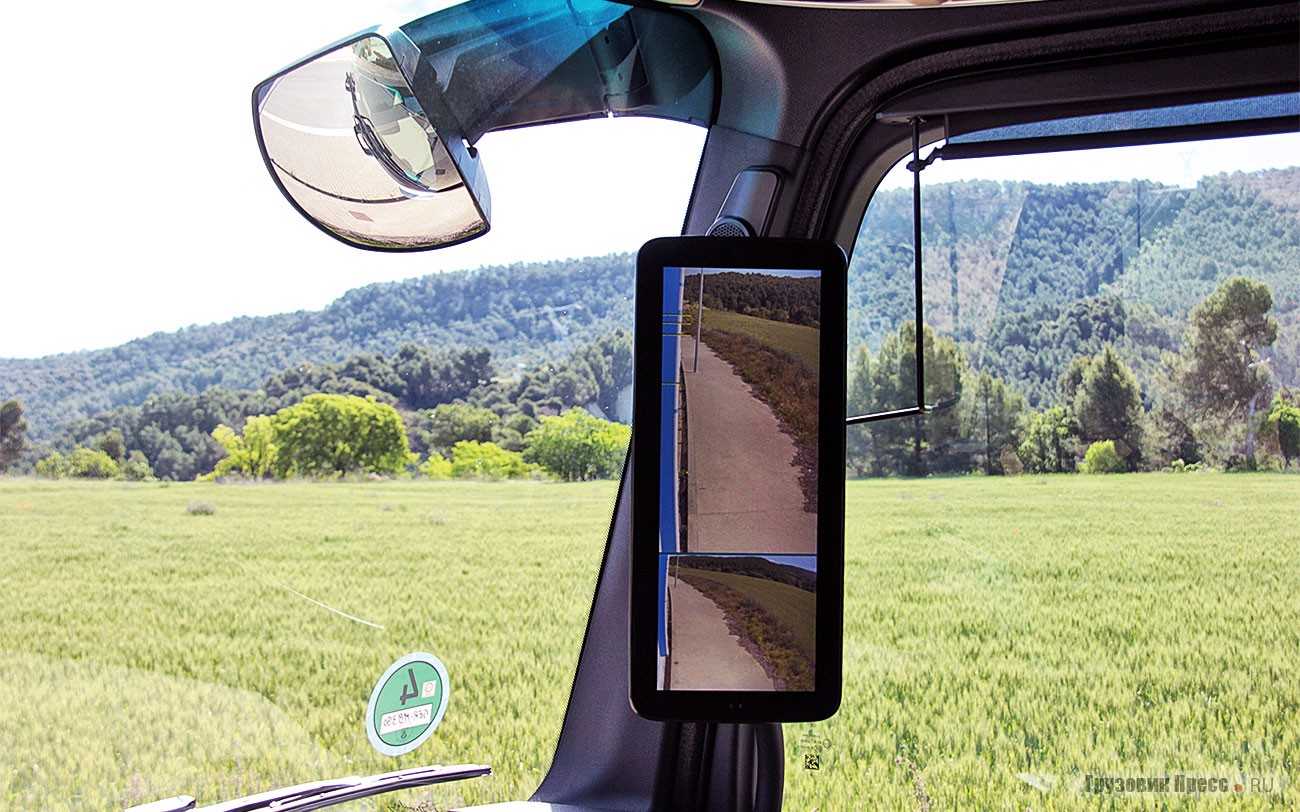 Как и у обычных зеркал, на мониторе две зоны, нижняя картинка имитирует полусферическое зеркало. Так вот мелкое и размазанное изображение в стеклянной полусфере уступило место чёткой контрастной картинке. В основном секторе, кроме изображения присутствует разметка границ транспортного средства и безопасной дистанции. Нижняя линия обозначает край габарита полуприцепа, три другие формируют безопасный динамический коридор при выполнении обгона или перестроении. Таким образом, при обгоне с использованием встречной полосы на узкой дороге, когда сокращается лобовая дистанция и хочется скорее покинуть неуютную полосу, эта благородная система поможет не «срезать» и не «просадить на подъём» попутно движущегося коллегу. Днём система предотвращает ослепление водителя сзади прямыми солнечными лучами, а с наступлением темноты переходит в режим ночного видения.