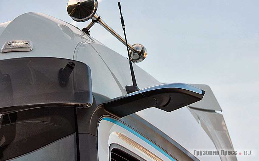 В отсеке над ветровым стеклом находится зеркало для бритья размером 21х15 см, складывающееся, выдвигающееся и регулируемое по наклону. Оно входит в стандартную комплектацию в кабине L с высокой крышей и в кабине Megaspace.
