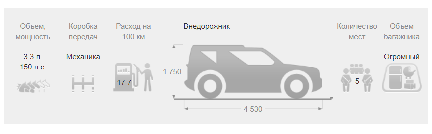 - 3,3, 150 л. с., механика, полный, 12 сек до 100 км/час, 17,7/10,4 л на 100 км