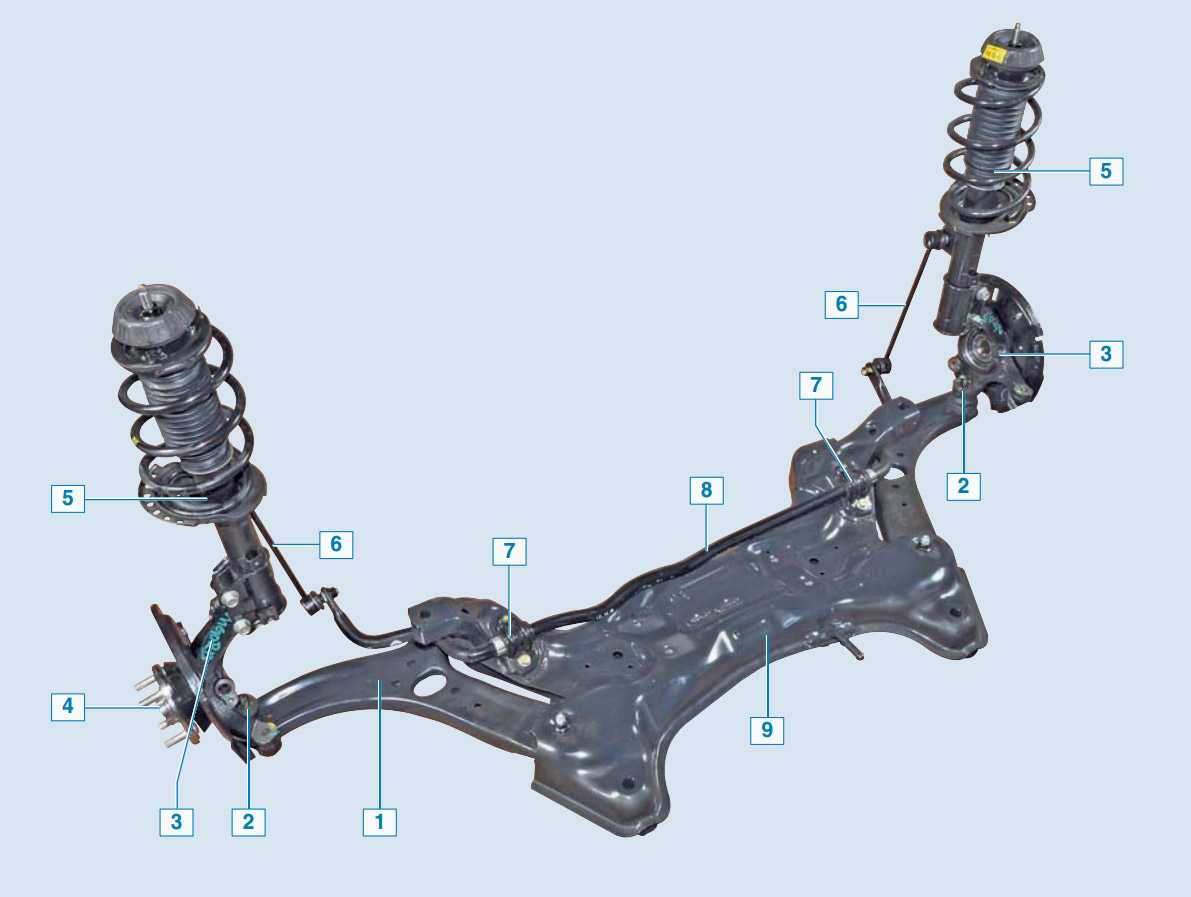 Передняя подвеска Хендай Солярис второго поколения состоит из следующих деталей: