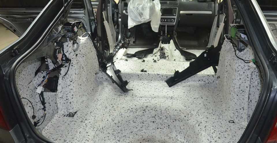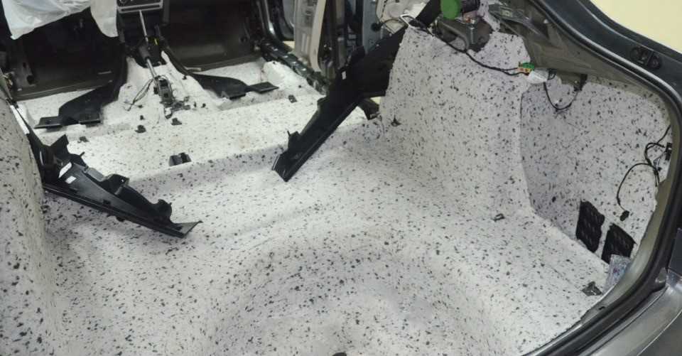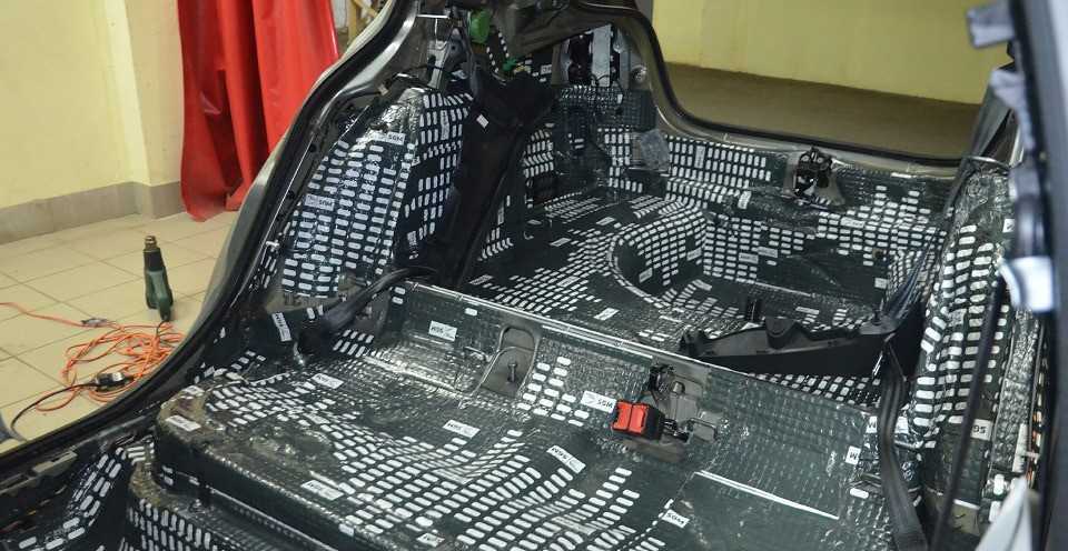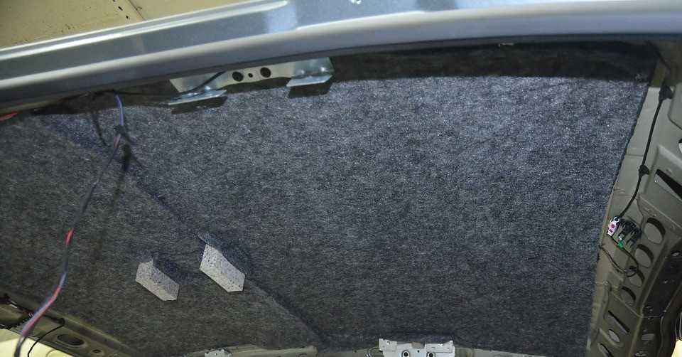 - На внутреннюю, невидимую часть клеем шумоизоляцию и ткань, которая будет просто защищать от разрушений.