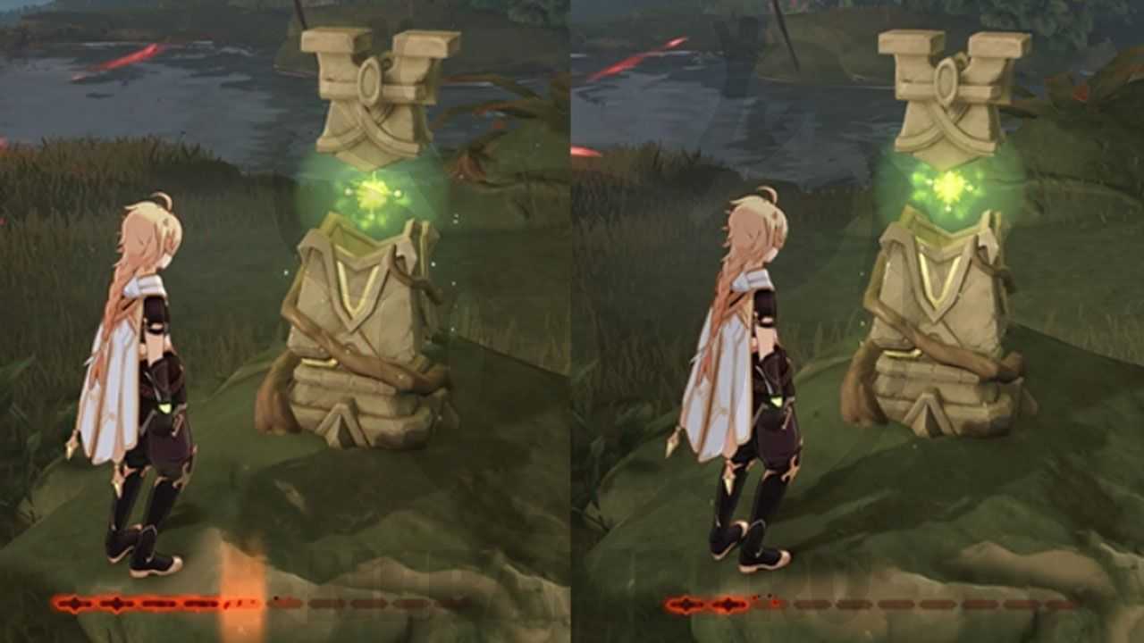 Этот портал работает почти по тому же принципу, что и фазовые врата из Инадзумы. Вы поднимитесь наверх, а потом приземлитесь в новой области со вторым куском янтаря. Подберите его. Затем воспользуйтесь четырехлистным символом наверху (клавиша «Т»), чтобы подняться на выступ и пройти вперед.