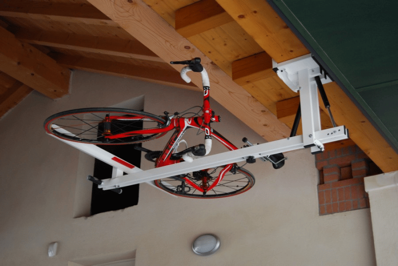 Особняком стоят подвесные системы, позволяющие хранить велосипеды всех членов семьи под потолком гаража или остеклённой лоджии. Стоимость такой потолочной системы хранения для четырёх велосипедов с удобным механизмом опускания превышает 10 тысяч рублей