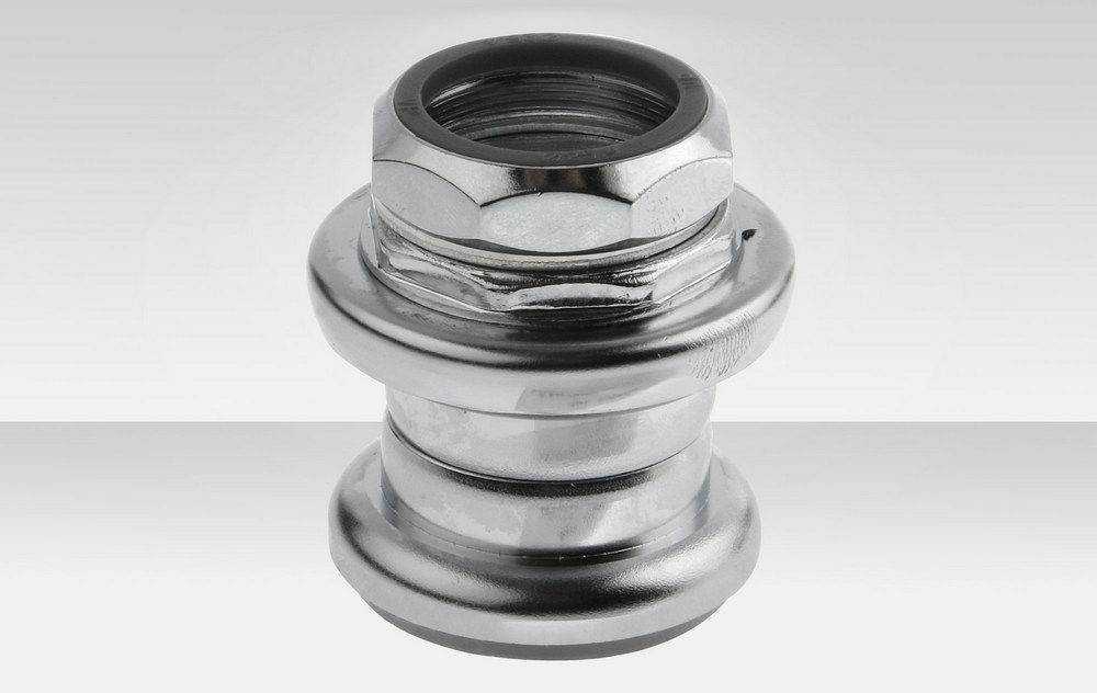 Начинать будем с классики — резьбового варианта. Раньше такая деталь устанавливалась повсюду, а теперь встречается исключительно на бюджетных вариантах. Такой элемент является неприхотливым в обслуживании, лёгким, доступным. Не зря ведь он используется уже не одно десятилетие. Резьбовая рулевая колонка велосипеда обладает и некоторыми недостатками. К ним относится невысокая надёжность и сложный процесс регулирования. В конструкцию входит резьба, которая располагается на верхней чашке велосипедной колонки. Закрепление рулевой трубы осуществляется при помощи контргайки.