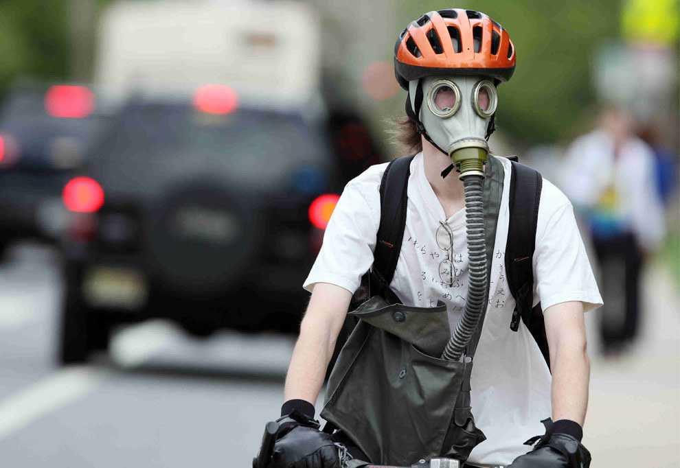 Для катания по городу велосипедисту нужен респиратор, для того чтобы защититься от всех вредных веществ, содержащихся в выхлопных газах.